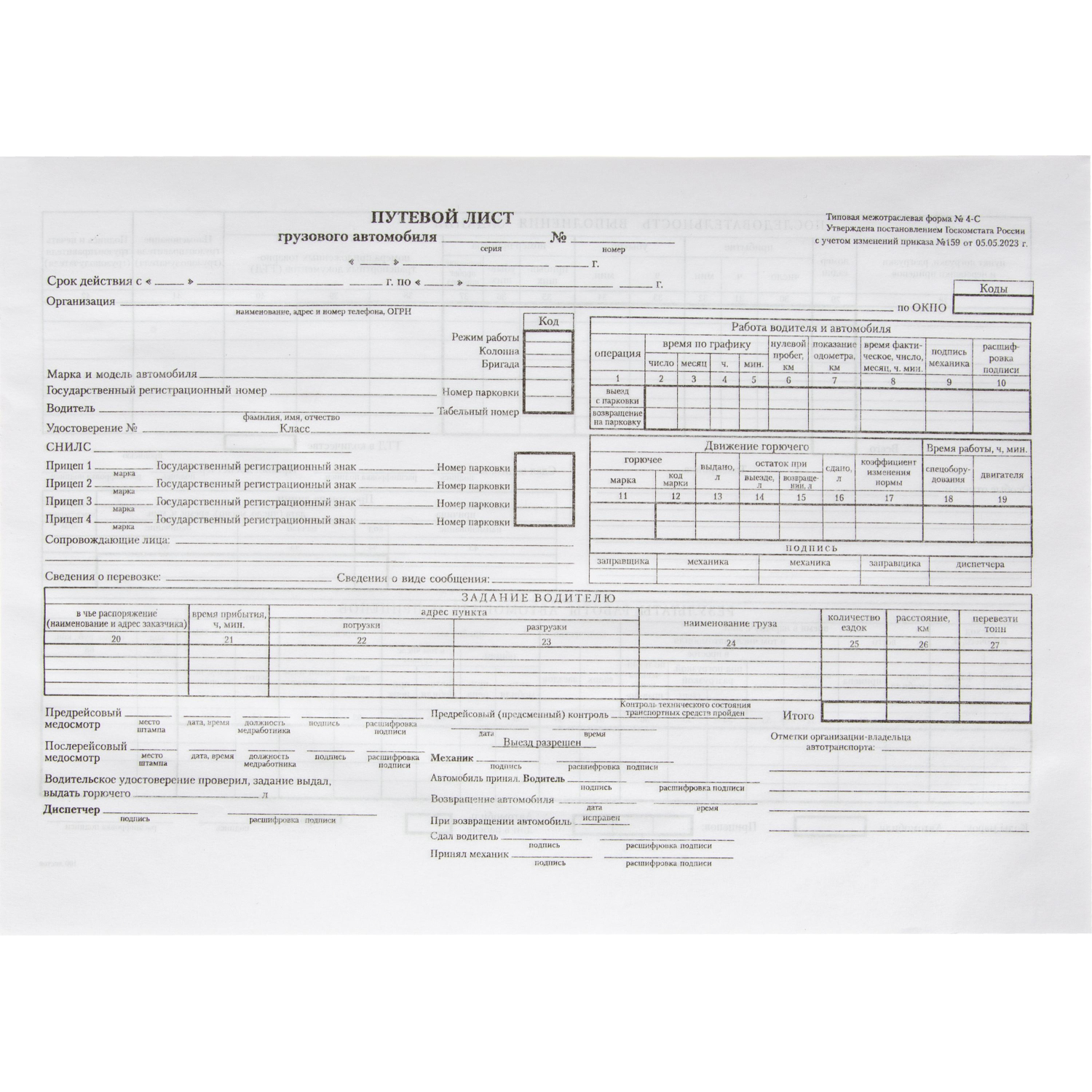 Бухгалтерский бланк Путевой лист грузового автомобиля формы 4-С. Изготовлен из офсета. 100 листов в книжке. Размер бланка 195×270 мм. Упакованы в термоусадочную пленку. Отсчет и запаковка бланков осуществляются на автоматическом оборудовании. В связи с этим, согласно имеющимся допускам оборудования, погрешность в количестве бланков в упаковке может составлять +/-3%. Цвет белый, белизна от 92%.