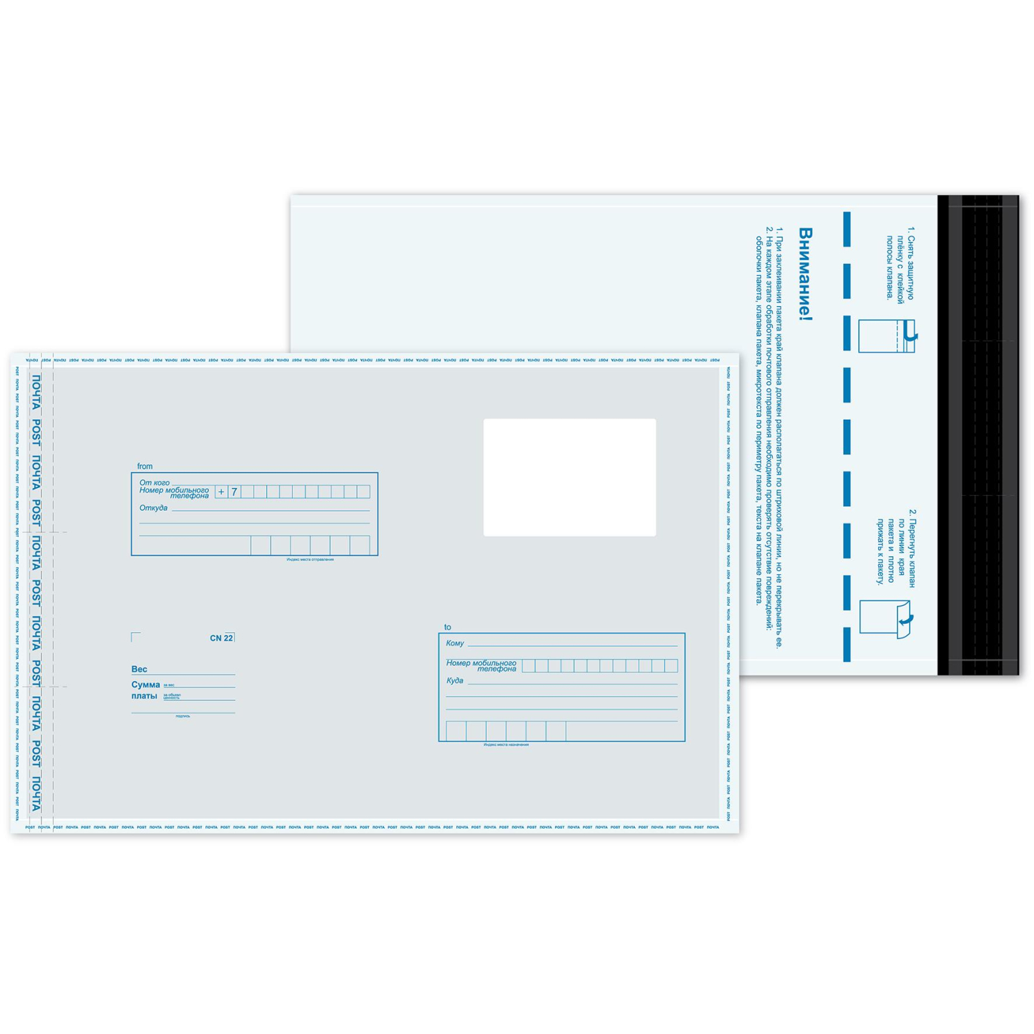 Пакет С4 (229×324 мм) из полиэтилена 70 мкм стрип (500 штук в упаковке). Оснащен почтовым подсказом ’Куда-Кому’ и отрывной клейкой лентой. Благодаря специальному прочному шву с микротекстом и специальным линиям просечек с защитным текстом на клапане предотвращает несанкционированное вскрытие. Имеет зону для нанесения шариковой ручкой надписей, оттисков штемпелей и не допускают их истирания при обработке и транспортировке. Многослойный полиэтилен защищает вложение от влаги и механических повреждений, непрозрачность исключает возможность определить содержимое. Предназначен для пересылки всех видов почтовых отправлений — писем, бандеролей и других видов отправлений.