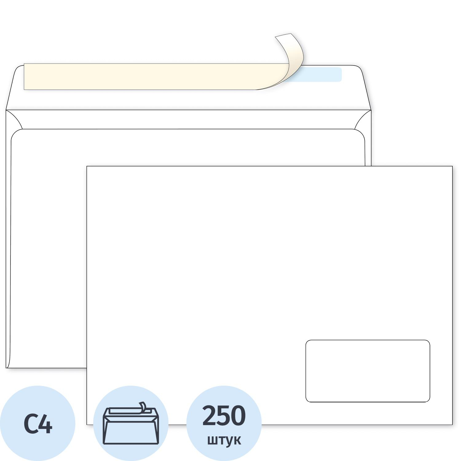 Конверт Ecopost C4 90 г/кв.м белый стрип с правым окном (250 штук в упаковке) 229×324 мм (вмещает лист формата А4 разложенный полностью), удобен для пересылки документов формата A4. Выполнен из офсета 90 г/кв.м 100% белизны, без внутренней запечатки, имеет клеевое нанесение типа стрип (отрывная силиконовая лента). Предназначены для пересылки 50 листов А4 формата, что равно 250 г веса. Товар без внутренней запечатки, не подходит для конфиденциальной переписки.