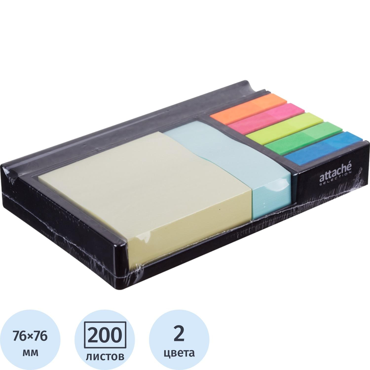 Набор Attache Selection в пластиковом диспенсере черного цвета. Размер диспенсера — 166×106×27 мм. В набор входят блоки: 76×76 мм и 76×25 мм (по 200 листов каждый). Пластиковые закладки 5 цветов по 20 листов, размер одной закладки — 12×45 мм.