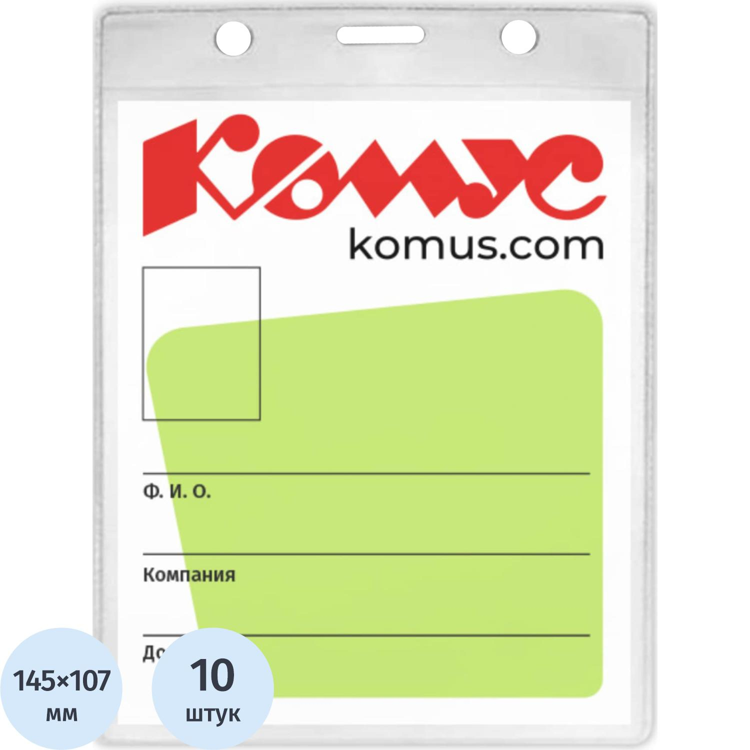 Бейдж Комус вертикальный,изготовлен из прозрачного пластика. Размер бейджа — 163×114 мм. В качестве крепежного элемента может использоваться ретрактор, лента с клипсой, клипса с булавкой, шнур, карабин. Для крепления имеет одно овальное (длина 14 мм) и 2 круглых (диаметр 6 мм) отверстия.Подходит для ношения именных карточек и пропусков. Поставляется в упаковке в количестве 10 штук.