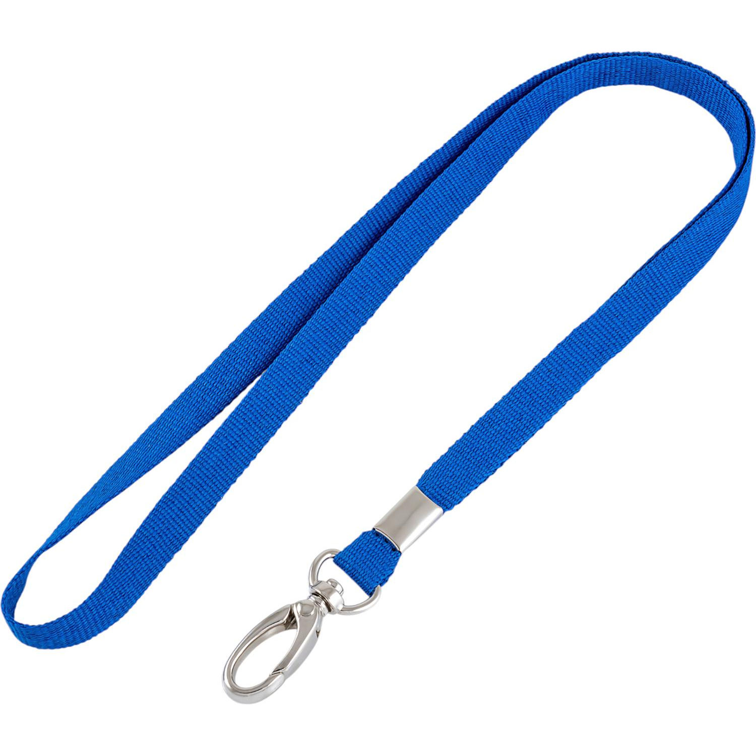 Лента для бейджа синего цвета с карабином-клешня. Лента изготовлена из репсового материала. Длина — 90 см, ширина — 10 мм. Используется для фиксации бейджа или пропуска.
