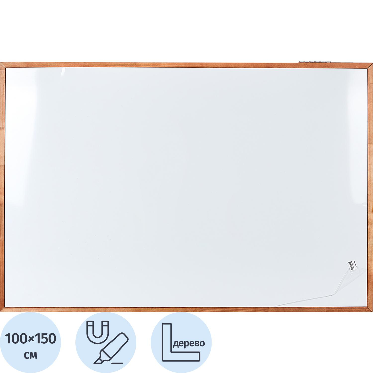 Доска магнитно-маркерная Attache Wood 100×150 см односекционная с лаковым покрытием Магнитно-маркерная доска в деревянном окрашенном профиле — это стильный и практичный вариант для офисов, учебных заведений и домашнего использования. Рабочее поле доски предназначено для письма маркерами для белых досок и крепления информации с помощью магнитов. Рама выполнена из деревянного профиля шириной 25 мм, окрашенного в тёмное дерево (морилка), с качественной обработкой, без сколов и сучков. Конструкция рамы включает сращивание деревянных элементов, что создаёт на изделии зигзагообразные швы, придавая доске уникальный вид. Настенная доска фиксируется четырьмя пластиковыми кронштейнами и допускает горизонтальное расположение. В комплект входит набор для крепления к стене. Размер рабочей поверхности: 96.7×148 см. Для удаления плёнки потяните за верхний свободный угол, плёнка легко отойдёт от рабочей поверхности. При необходимости проведите вдоль рамы канцелярским ножом.