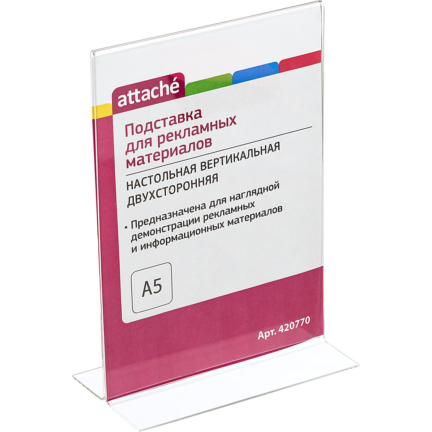 Вертикальная двухсторонняя настольная информационная подставка Attache изготовлена из прозрачного акрила, имеет устойчивое основание. Позволяет размещать постеры и другие демонстрационные материалы формата А5. Поставляется в индивидуальной защитной пленке, перед применением снять. Размеры (ВxШxГ): 210×148×70 мм.
