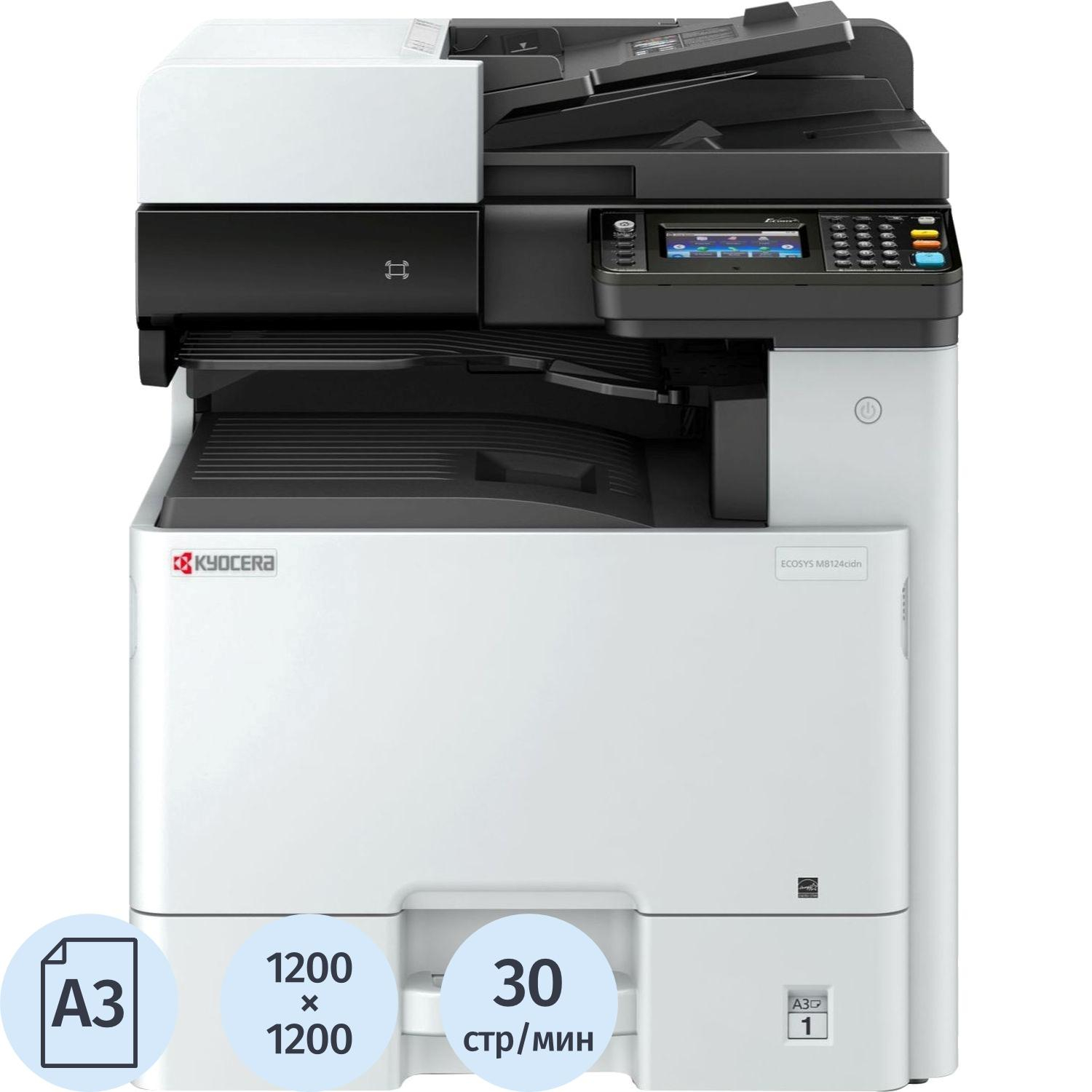 МФУ лазерное цветное Kyocera ECOSYS M8130cidn (1102P33NL0)Обращаем Ваше внимание, что кабель USB не идет в комплекте с МФУ. Подходящий к данному устройству кабель Вы можете выбрать в разделе 'Сопутствующие товары'Стартовый картридж входит в комплект поставки. Ресурс такого картриджа меньше, чем у стандартного.Данное устройство не требует настройки сервисным инженером. Вы можете подключить и запустить его самостоятельно с помощью руководства пользователя.Внешний вид и/или характеристики товара могут быть изменены производителем в соответствии с производственным процессом.