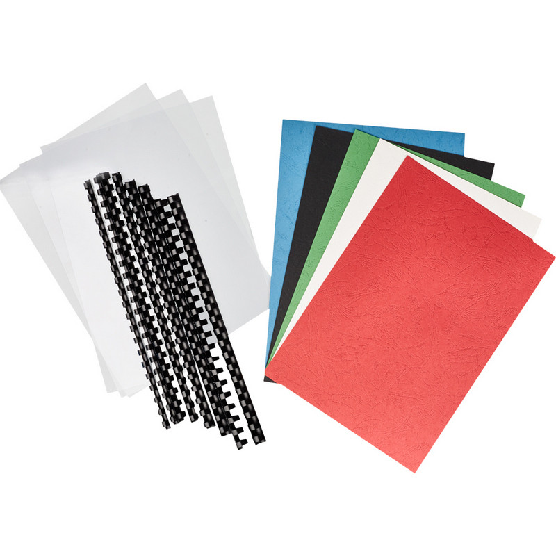 Стартовый набор для переплета ProfiOffice. При помощи одного такого набора вы сможете подготовить 25 различных брошюр. В его состав входят: обложки пластиковые прозрачные 25 шт., обложки картонные плотностью 230 г/кв.м с тиснением под кожу, различных цветов: белые, черные, красные, синие, зеленые (по 5 шт. каждого цвета). А также пружины пластиковые черного цвета, различных диаметров: 8 мм - 6 шт., 10 мм - 7 шт., 12 мм - 6 шт., 14 мм - 6 шт.