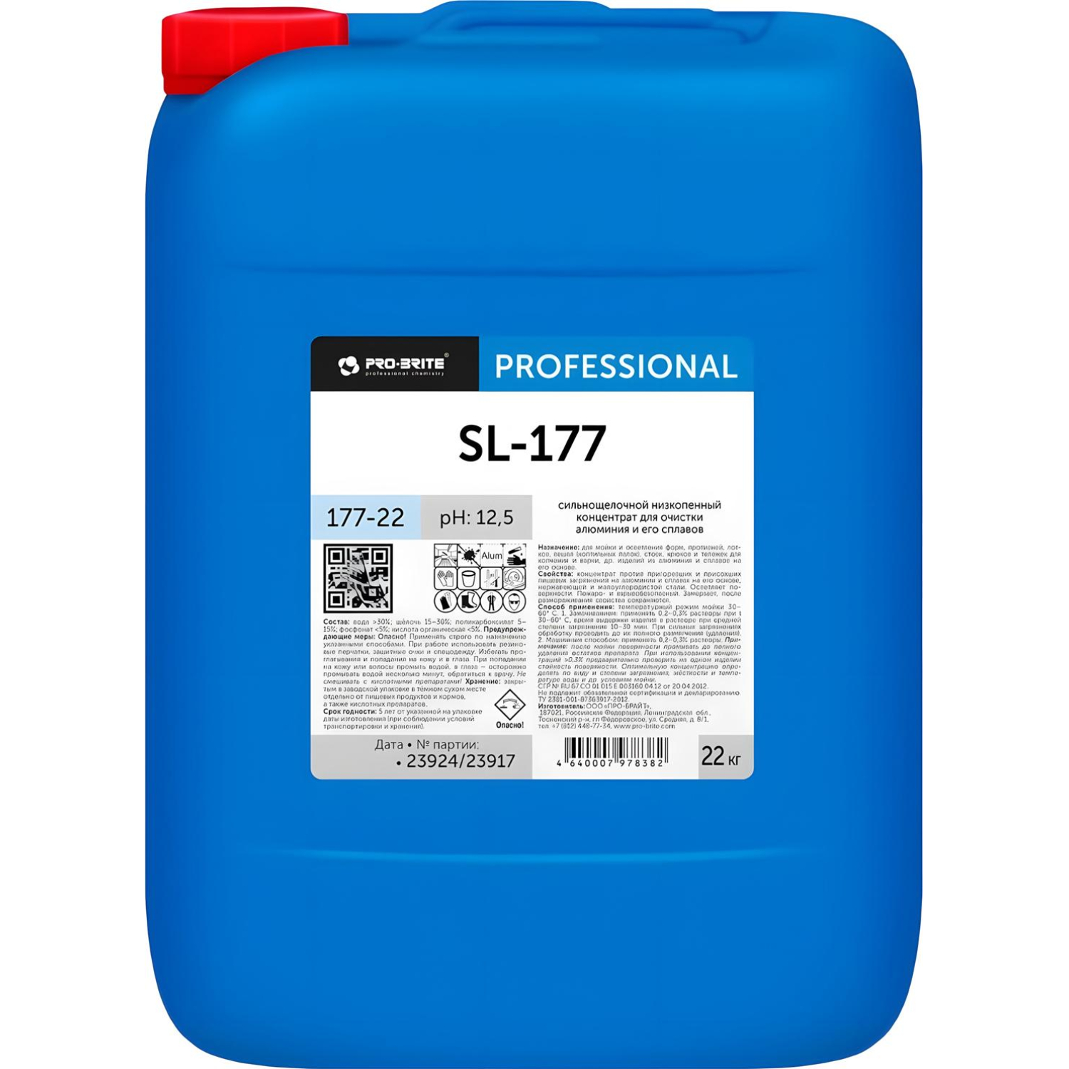 Средство для очистки алюминия Pro-Brite SL-177 Alum Dip 22 кг (концентрат)Назначение: для мойки и осветления форм, противней, лотков, вешал (коптильных палок), стоек, крюков и тележек для копчения и варки, др. изделий из алюминия и сплавов на его основе на предприятиях мясной, рыбной, кондитерской, хлебопекарной и др. отраслей, в организациях общественного питания. Свойства: жидкий сильнощелочной низкопенный концентрат, прозрачный без цвета со специфическим запахом, против пригоревших и присохших пищевых загрязнений на алюминии и сплавах на его основе, нержавеющей и малоуглеродистой стали. Осветляет поверхности. Пожаро- и взрывобезопасный. Замерзает, после размораживания свойства сохраняются. Способ применения: температурный режим мойки 30-60°C. Замачиванием: рекомендуется применять 0,2-0,3% растворы при t 30-60°C, время выдержки изделия в растворе при средней степени загрязнения 10-30мин. При сильных загрязнениях обработку проводить до их полного размягчения (удаления). Машинным способом: применять 0,2-0,3% растворы. Примечание: после мойки поверхности промывать до полного удаления остатков препарата. При использовании концентраций >0,3% предварительно проверить на одном изделии стойкость поверхности. Оптимальную концентрацию определять по виду и степени загрязнения, жёсткости и температуре воды и др. условиям мойки.Состав: вода >30%; щёлочь 15-30%; поликарбоксилат 5-15%; фосфонат <5%; кислота органическая <5%. Плотность: 1,27±0,05 г/см³ при 20°С. Значение pH 1%-раствора: 12,5±0,5 Меры предосторожности: опасно! Применять строго по назначению указанными способами. При работе использовать резиновые перчатки, защитные очки/маску и спецодежду. Избегать проглатывания, попадания на кожу и в глаза. При попадании на кожу или волосы промыть водой, в глаза — осторожно промывать водой несколько минут, обратиться к врачу. Не смешивать с кислотными препаратами! Условия хранения: плотно закрытым в заводской упаковке в тёмном сухом месте отдельно от пищевых продуктов и кормов, а также кислотных препаратов. Срок годности: 5 лет от даты изготовления (при соблюдении условий транспортировки и хранения).