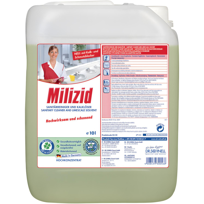 Универсальное чистящее средство Dr.Schnell Milizid жидкость 10 л.Профессиональное средство Milizid от Dr. Schnell предназначено для очистки санитарных зон и влажных помещений. Подходит для всех методов очистки поверхностей, устойчивых к воздействию кислот, очистки пола и стен, ручной очистки инвентаря, специальной, послестроистельной и генеральной уборки.Обладает специальным проникающим эффектом, способствующим быстрому отделению загрязнения с поверхности без дополнительного механического воздействия. Минимум усилий для длительного эффекта очистки.Особенности и преимущества:- Минимум усилий, длительный эффект очистки.- Обладает специальным проникающим эффектом, способствующим быстрому отделению загрязнения с поверхности без дополнительного механического воздействия.- Продукт зарегистрирован в перечне RK 0.25%-100% (список проверенных и рекомендованных средств для очистки всех существующих видов керамической плитки).- Идеально подходит для мягкой очистки пеной.- За секунды удаляет известковый налет, накипь, ржавчину, мочевой камень, жир, следы от косметики и мыльную пену.- При правильном применении защищает хромированные, пластиковые поверхности, кислотостойкую плитку, эмаль в соотв.с DIN ISO 2722.- В ассортименте Milizid с четырьмя ароматами для дополнительного дезодорирующего эффекта.- Продукт произведен в Германии. Область применения:Идеально для уборки коммерческой и некоммерческой недвижимости, производств, HoReCa и клининга.