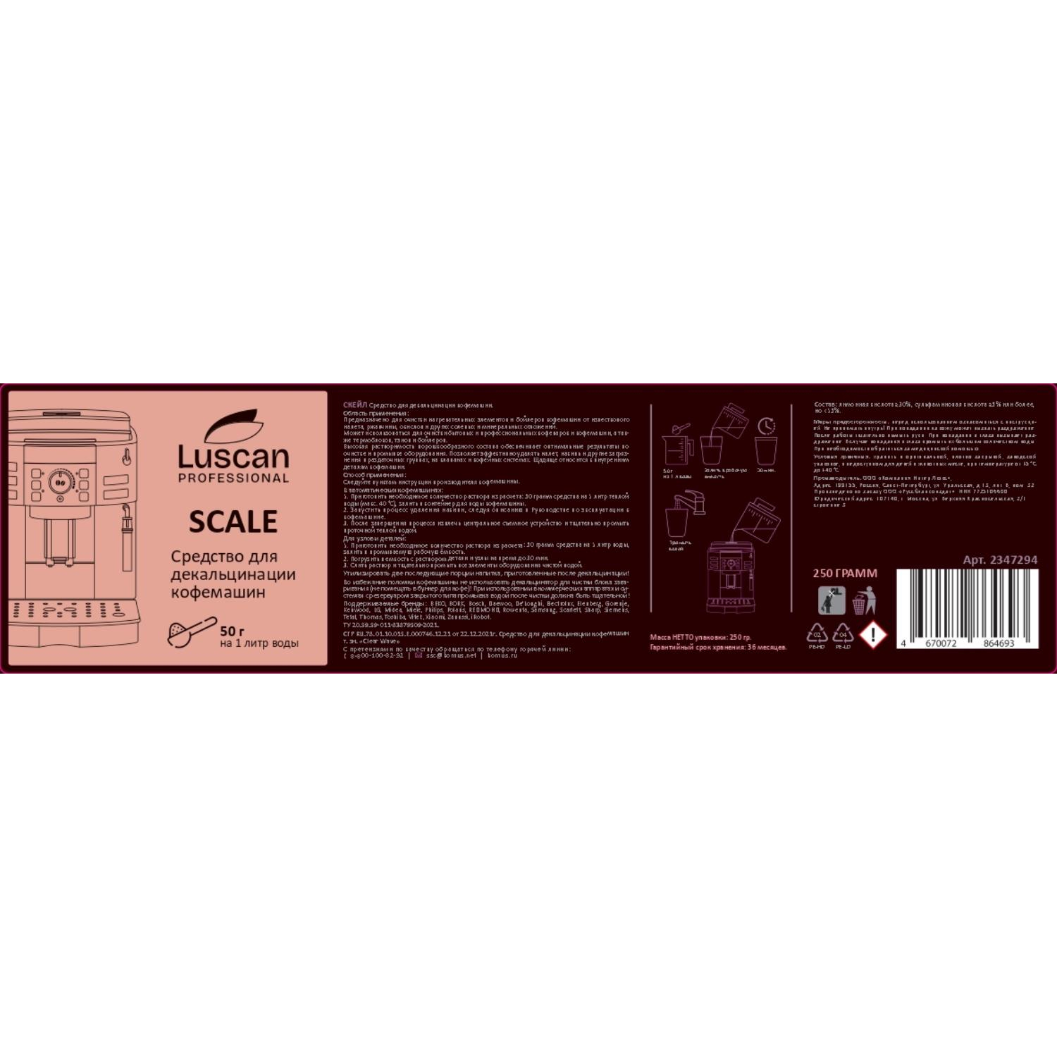 Средство для декальцинации кофемашин Luscan Professional 250 г (концентрат)Область применения.Предназначено для очистки нагревательных элементов и бойлеров кофемашин от известкового налёта, ржавчины, окислов и других солевых и минеральных отложений.Может использоваться для очистки бытовых и профессиональных кофеварок и кофемашин, а также термоблоков, тэнов и бойлеров.Высокая растворимость порошкообразного состава обеспечивает оптимальные результаты по очистке и промывке оборудования. Позволяет эффективно удалять кофейный налёт, накипь и другие загрязнения в раздаточных группах, на клапанах и кофейных системах. Щадяще относится к внутренним деталям кофемашин. Выполняет антибактериальную и дезинфицирующую функцию.Способ применения.Следуйте пунктам инструкции производителя кофемашины.В автоматических кофемашинах:1. Приготовить необходимое количество раствора из расчёта: 50 грамм средства на 1 литр тёплой воды (макс. 40°С), залить в контейнер для воды кофемашины.2. Запустить процесс удаления накипи, следуя описанию в Руководстве по эксплуатации к кофемашине.3. После завершения процесса извлечь центральное съёмное устройство и тщательно промыть проточной тёплой водой.Для узлов и деталей.1. Приготовить необходимое количество раствора из расчёта: 50 грамм средства на 1 литр воды, залить в промываемую рабочую ёмкость.2. Погрузить в ёмкость с раствором детали и узлы на время до 30 мин.3. Слить раствор и тщательно промыть все элементы оборудования чистой водой.Утилизировать две последующие порции напитка, приготовленные после декальцинации!Во избежание поломки кофемашины не использовать декальцинатор для чистки блока заваривания (не помещать в бункер для кофе)! При использовании в коммерческих аппаратах и системах с резервуаром закрытого типа промывка водой после чистки должна быть тщательной!Поддерживаемые бренды.BEKO, BORK, Bosch, Daewoo, De’Longhi, Electrolux, Elenberg, Gorenje, Kenwood, LG, Midea, Miele, Philips, Polaris, REDMOND, Rowenta, Samsung, Scarlett, Sharp, Siemens, Tefal, Thomas, Toshiba, Vitek, Xiaomi, Zanussi, iRobot.Состав: лимонная кислота ≥30%, сульфаминовая кислота ≥5% или более, но <15%.Меры предосторожности: перед использованием ознакомиться с инструкцией. Не принимать внутрь! При попадании на кожу может вызвать раздражение. После работы тщательно вымыть руки. При попадании в глаза вызывает раздражение. В случае попадания в глаза промыть их большим количеством воды. При необходимости обратиться за медицинской помощью.Условия хранения: хранить в оригинальной, плотно закрытой, заводской упаковке, в недоступном для детей и животных месте, при температуре от +5°С до +40°С.