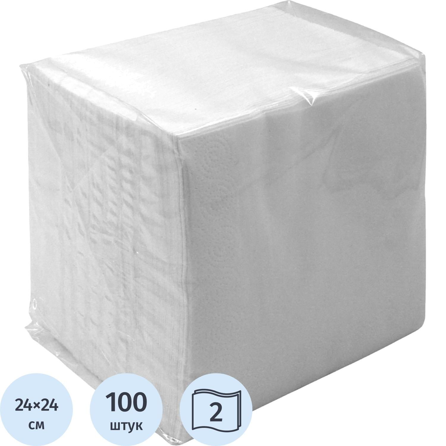 Салфетки бумажные сервировочные 2-слойные 24×24 см (100 листов в пачке)Двухслойные салфетки выполнены в белом цвете. Прекрасно подходят для повседневного использования, в повседневном быту, на офисной кухне, на фуршетах и различных увеселительных мероприятиях, в столовых, в кафе и т.д. Размеры развёрнутой салфетки: 24×24 см.Изготовлены из 100% целлюлозы. Поставляются пачками по 100 шт.