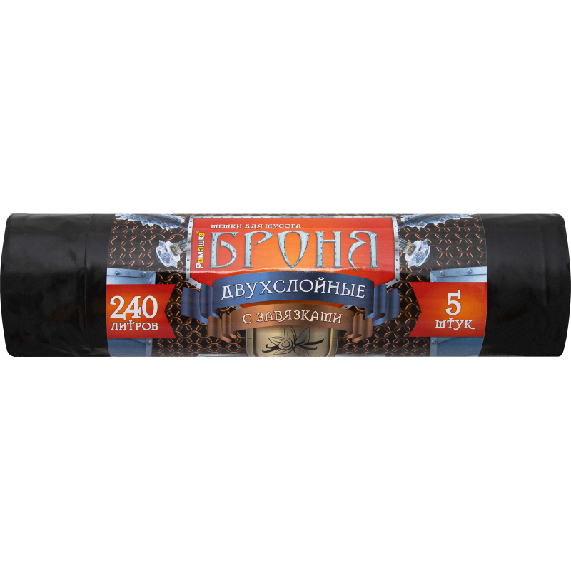 Мешки для мусора Ромашка Броня 240 л с завязками черные (ПВД, 55 мкм). Данные пакеты нашли широкое применение в домашнем использовании, в офисе, в производственных помещениях и государственных учреждениях (поликлиниках, школах, детских садах и пр.). Изготовлены из полиэтилена высокого давления (ПВД). Не являются ароматизированными и биоразлагаемыми. Упакованы по 5 пакетов в рулоне. Законодательные и технические документы