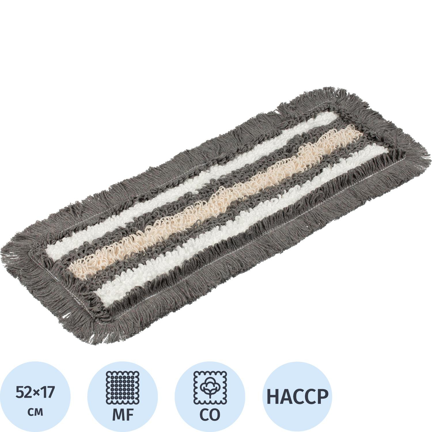 Насадка МОП для швабры-флаундера (плоской) Росмоп хлопок/микрофибра 52×17 см бежевая/серая/белаяПетельный комбинированный МОП из серой пряжи подходит для уборки после ремонта, генеральной и ежедневной поддерживающей очистки. Серый цвет делает МОП менее марким при длительной эксплуатации, а белые вставки из микроволокна позволяют контролировать степень загрязнения в процессе работы.МОП легко скользит по полу, удобен в использовании и обеспечивает высокое качество очистки. Ряды петель расположены плотно, что снижает износ и продлевает срок службы. Благодаря термической обработке серых волокон в процессе окрашивания, из них удалены остатки масляных пропиток, поэтому МОП демонстрирует максимальное влагопоглощение уже при первом применении.Подходит для использования с различными типами держателей. Средний срок службы — 5-6 месяцев. Материал: хлопок и микрофибра.
