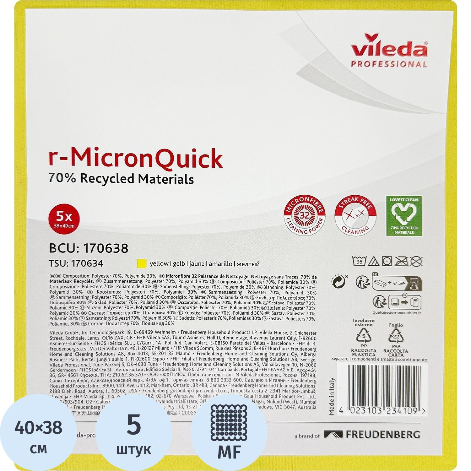 Салфетки хозяйственные Vileda Professional микрофибра 40×38 см 135 г/кв.м жёлтые (5 штук в упаковке)Уникальная салфетка р-МикронКвик от Vileda Professional из нетканого микроволокна предназначена для профессиональной уборки гладких и деликатных поверхностей. Сделана из переработанных материалов. Для удобства уборки салфетки представлены в четырёх цветах: синий (арт. 1640476), красный (арт. 1640477), жёлтый (арт. 1689205), зелёный (арт. 1689204). Салфетка р-МикронКвик эффективно удаляет отпечатки пальцев, ежедневные загрязнения, а также бактерии и вирусы. Подходит для финишной протирки гладких и деликатных поверхностей, включая зеркальные, стеклянные, хромированные, стальные, глянцевые, керамические, полированные.Подходит для уборки методом Свеп Про или спрей-методом. Особенности и преимущества:— уникальное ультратонкое нетканое микроволокно разделено на 32 сегмента для более глубокого проникновения в поверхность и максимально эффективной очистки; — отлично очищает и полирует: убирает без разводов и ворса, за счёт чего повышается скорость уборки, так как поверхности протираются за 1 раз; — салфетки р-МикронКвик убирают до 99,99 % бактерий (по результатам лабораторных испытаний салфетки, смоченной стерильной водой в лаборатории BMA-Labor GBR, Германия от 30.08.2021 г.) и 99,99 % коронавируса типа BCoV с поверхностей без использования дезинфектанта (по результатам лабораторных испытаний салфетки, смоченной водой, в Институте гигиены и микробиологии Dr. Brill + Partner GmbH, Германия от 07.10.2021 г. BCoV — разновидность коронавируса, сходного по структуре с человеческим и разрешённая к лабораторным тестирования); — приятная на ощупь и комфортная в использовании; — очень долгий срок службы и устойчивость к повреждениям и образованию катышек; — 4 цвета для кодирования зон и исключения перекрёстных загрязнений; — сделана на 70 % из переработанного пластика PES; — маркировка Love It Clean доказывает вклад в устойчивое развитие. Продукт произведён в Италии. Область применения: Идеальна для уборки коммерческой и некоммерческой недвижимости: бизнес-центров, торговых и жилых комплексов, офисов, спортзалов, культурных и учебных заведений, объектов здравоохранения и HoReCa. Подходит для чистых помещений классов GMP C-D, CNC, ISO: 7-9, а также стандартов ГОСТ Р-52249-2009 и ГОСТ Р ISO 14644-1-2017. Экологичность: салфетка на 70 % состоит из переработанного пластика PES и рассчитана на многоразовое использование, что сокращает количество одноразовых материалов. Салфетка р-МикронКвик — это высококачественный инструмент для эффективной, экологичной и профессиональной уборки.Характеристики: — толщина: 0,55 мм; — вес: 20 г; — максимальная впитываемость в сухом состоянии: 450 % от собственного веса; — дозировка на 1 ед.: 40 мл моющего раствора; — количество машинных стирок: до 500 при температуре 60 °C и соблюдении рекомендаций Vileda Professional.