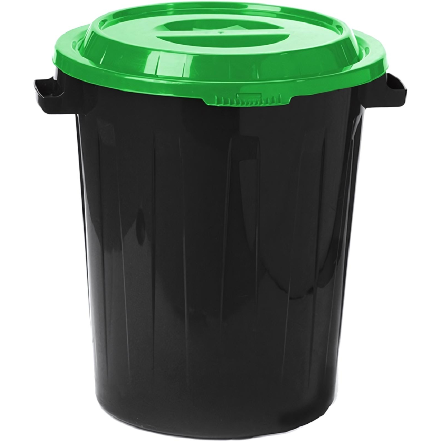 Контейнер-бак мусорный 60 л пластиковый с крышкой черный/зеленый. Бак 60 л предназначен для бытового использования. Произведен из пищевого пластика, подходит в качестве емкости для хранения питьевой воды; для хранения продуктов питания, фруктов, овощей. Бак устойчив и надежен. Конструкция ручки и отсутствие режущих краев удобны при переносе тяжестей. Плотно закрывающаяся крышка удобна для переноски и хранения. Высота бака: 55 см Диаметр: 48 смШирина с ручками: 53 см Материал: полипропилен (безопасный, пищевой, возможно использование при низких и высоких температурах: от -30 до 60°С) Цвет: черный/зеленый Вес: 2.07 кг. Внимание: в характеристике 'Объем рекомендуемого мешка' указан минимальный объем мешка, который подойдет для изделия. Рекомендуется приобретать мешки указанного, либо большего объема.