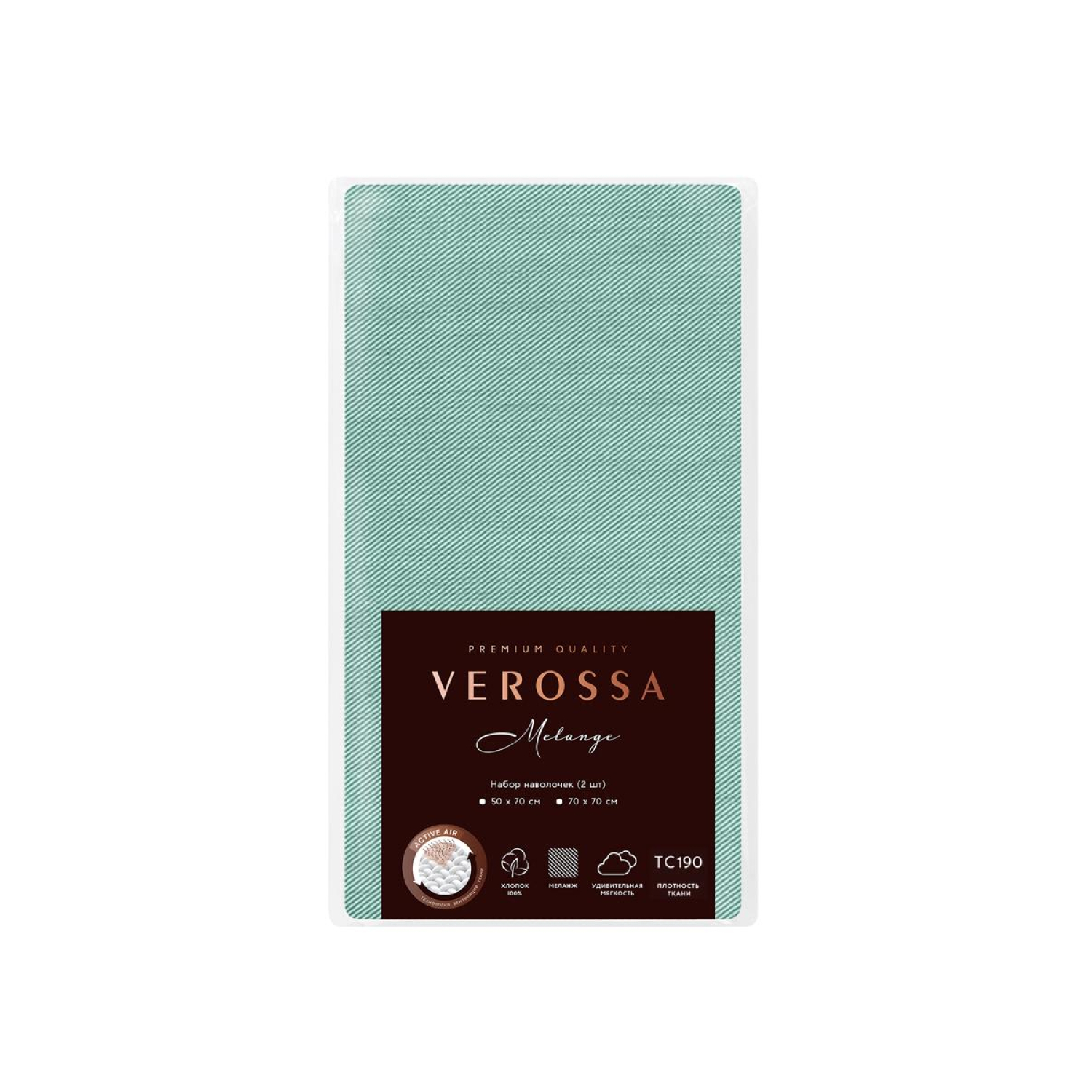Наволочка Verossa Emerald 70×70 см меланж 130 г/кв.м зелёный (2 штуки в упаковке)Меланжевая ткань создаётся благодаря особому диагональному плетению волокон разного оттенка и цвета. Для производства этой ткани используются тонкие нити из 100% хлопка, что придаёт ткани особый дышащий эффект и превосходную терморегуляцию, а тактильные ощущения дарят удовольствие, как от прикосновений к шёлку. Технология Active Air способствует комфорту, лёгкости и отличной регенерации кожи, во время одного из самых важных процессов жизни — сна. Нанесённый на ткань натуральный состав, позволяет использовать изделия без тщательного отглаживания. Размер наволочки 70×70 см. Поставляются по 2 штуки. Плотность ткани: 130 г/кв.м.Внимание! Перед первым использованием обязательна стирка!