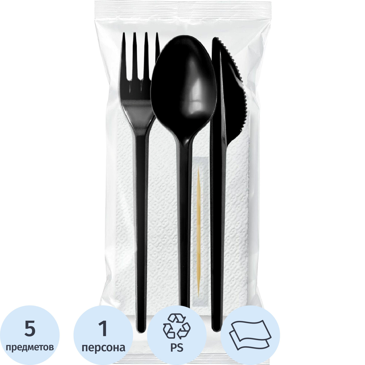 Набор одноразовых столовых приборов Комус № 5 на 1 персону (5 предметов, 200 наборов в упаковке). Набор одноразовых столовых приборов на 1 персону в особенности удобен для отдыха на природе. В набор входят: — 1 вилка черная 180 мм; — 1 ложка столовая черная 180 мм; — 1 нож черный 180 мм; — салфетка размером 20×20 см; — зубочистка размером 5.5 см. Набор изготовлен из качественного полистирола (PS6) и целлюлозы. Разрешен контакт с холодными и горячими до +75 °C пищевыми продуктами. Срок годности не ограничен, при соблюдении условий хранения. Каждый набор находится в индивидуальной упаковке с удобной перфорацией для вскрытия пакета. В общей упаковке 200 наборов. Товар произведен под контролем «Комус». Мы специально позаботились о Партнерах, которые превыше всего ценят качество и комфорт, и разработали линейку Одноразовой посуды самых востребованных размеров для обеспечения быстрого питания в офисе, образовательных и производственных учреждениях, сферы гостеприимства и общественного питания и многих других. Производство расположено в России, что гарантирует постоянный контроль качества и оптимальные цены. Внимание! Товар поставляется в транспортном коробе (короба могут отличаться по форме и размеру).