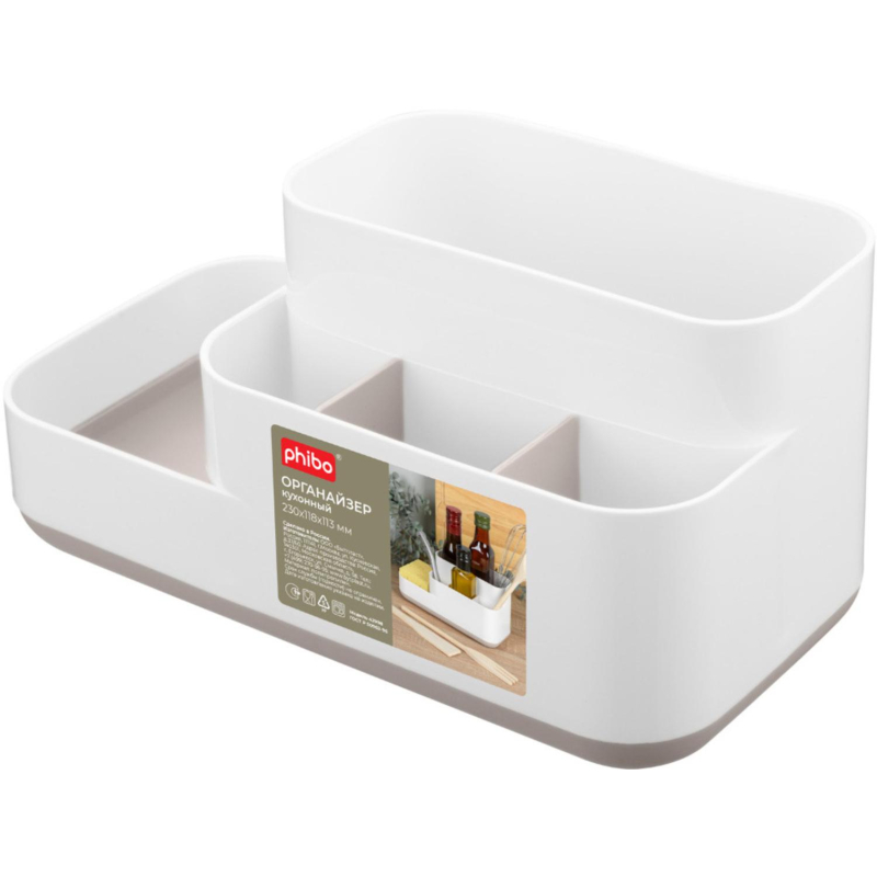 Органайзер кухонный Phibo 230×118 мм Органайзер кухонный поможет поддержать порядок на кухне. Секции разной высоты и ширины позволяют разместить в органайзере бутылочки с соусами или различные кухонные аксессуары, храня их под рукой. Благодаря минималистичному элегантному дизайну в сдержанной цветовой гамме, органайзер дополнит любой кухонный интерьер. Подходит для использования в комнатах с повышенной влажностью, легко моется в посудомоечной машине.Изготавливается из 100% перерабатываемого безопасного полипропилена. Размер: 230×118×113 мм.