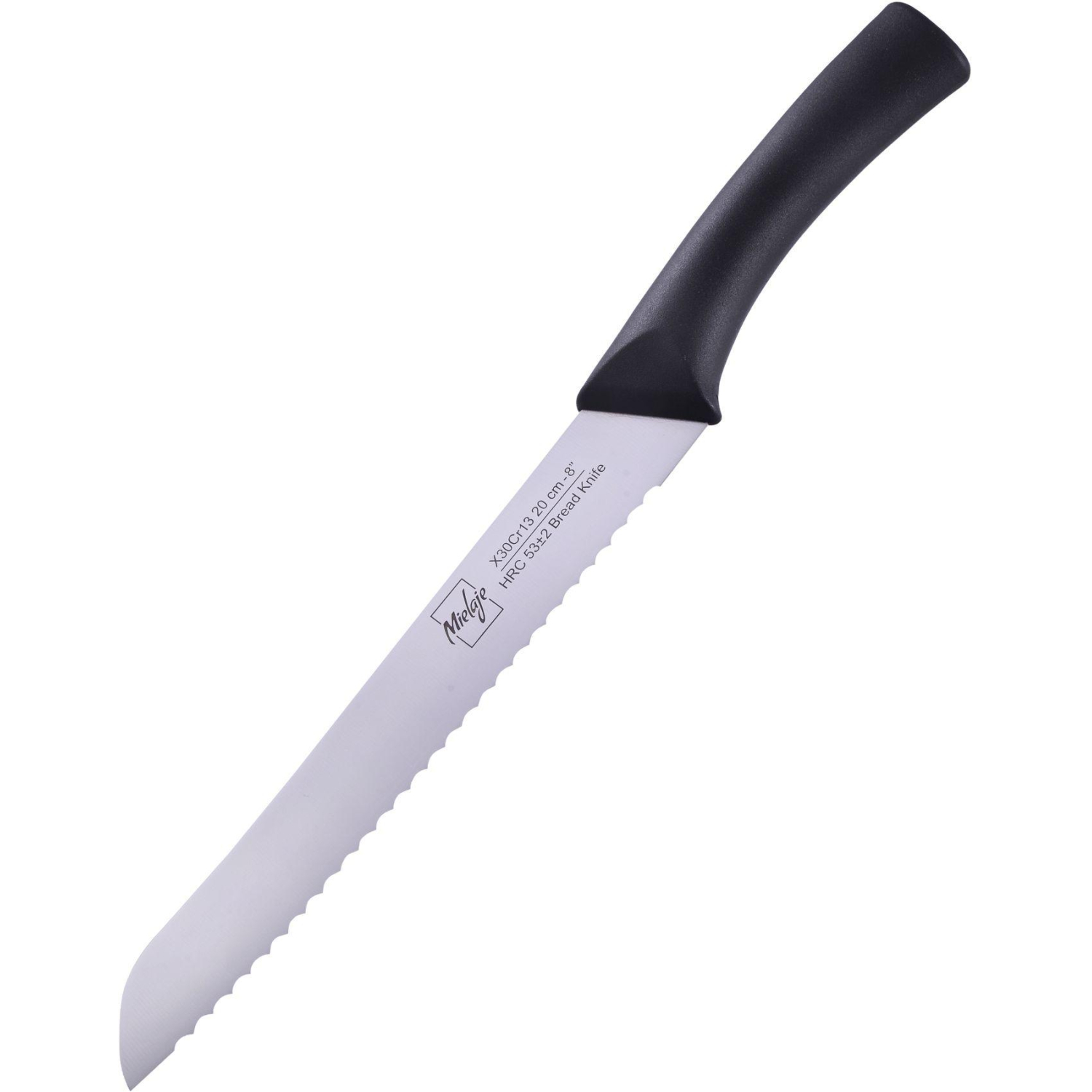 Нож кухонный Mielaje хлебный лезвие 20 см (41720).Ножи Mielaje изготовлены из высоколегированной углеродистой стали и соответствует 420 маркировке. Сталь упрочняется термообработкой и обладает высокой износостойкостью, ударной вязкостью, жароустойчивостью. В ее состав входят такие основные химические элементы, как хром (Cr), магний (Mg). Ножи отличаются высокой прочностью, превосходными характеристиками, удобной рукояткой из полипропилена. Долговечность, изящность и прекрасные режущие свойства делают ножи Mielaje очевидным выбором для многих. Они очень удобны, несмотря на кажущуюся простоту, предназначены для долговременной работы, рукоять приятно охватывается рукой, эргономична. Ножи, благодаря такой рукояти великолепно управляемы. Каким бы отличным не было качество ножей, если его неправильно использовать, то он долго не прослужит. Вот наши рекомендации по уходу и использованию ножей: — храните ножи отдельно от остальной посуды; — самый лучший способ хранения ножей — с помощью магнитного держателя или специальной подставки для ножей; — никогда не замачивайте ножи с грязной посудой, потому что под воздействием щелочей (от моющих средств), пищевых кислот и воды, сталь коррозирует; — кухонный нож должен только резать, для каждой работы выбирайте подходящий по размеру нож. Не стоит ножом открывать консервные банки, использовать вместо отвертки или молотка; — не режьте на стеклянных или металлических досках, они тупят нож, лучше резать на деревянных или пластиковых досках; — не разрубайте ножом кости, воспользуйтесь лучше специальным топориком; — для заточки используйте мусаты, ножеточки и другие специальные приспособления, не точите ножи с зубчатым лезвием или со специальным покрытием. Нож с волнообразным лезвием не предназначен для заточки; — для того чтобы заточить нож, достаточно перпендикулярно вставить его в паз точилки и легко, без нажима провести в направлении «вперед-назад» около 8 раз; — перед первым использованием требуется тщательно промыть изделия; — хранить изделия в чистом, сухом виде; — не рекомендуется использовать губки с абразивным слоем; — не рекомендуется промывка изделий в посудомоечной машине с использованием моющих средств, в состав которых входит активный кислород. И тогда, Ваш, остро заточенный нож ответит самым взыскательным требованиям профессионального кулинара и превзойдет ожидания любой домохозяйки.