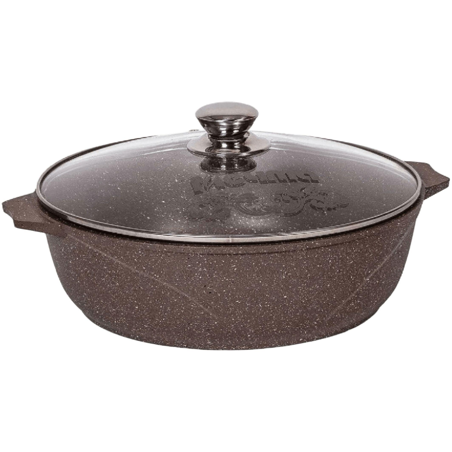 Жаровня Мечта Гранит Brown диаметр 26 см 3 л алюминий (33806) Серия Гранит brown — это литая алюминиевая толстостенная посуда с антипригарным покрытием повышенной стойкости, разработанным фирмой Weilburger Coatings GmbH. Покрытие разработано на водной основе и не содержит перфтороктановую кислоту. Благодаря слою, упроченному кристаллами минералов, покрытие отличается особой износостойкостью и отличными антипригарными свойствами. Цвет — коричневый. Объём: 3 л. Размер: 26×8 см. Сделана из алюминия. Со стеклянной крышкой в комплекте. Подходит для всех типов плит, кроме индукционных. Можно мыть в посудомоечной машине и использовать в духовке.