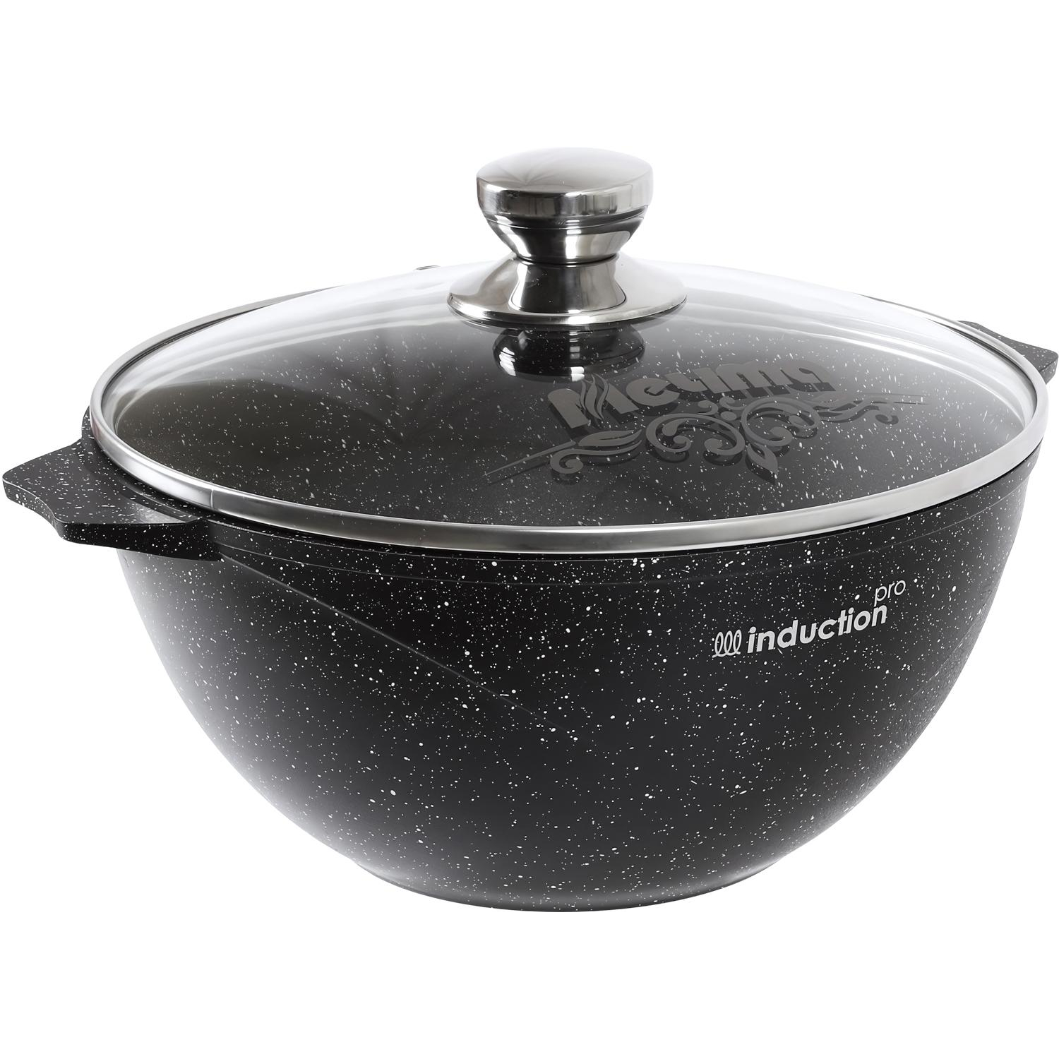 Казан алюминиевый Мечта Гранит black Induction Pro 54802И 4.5 л черный. Казан индукционный со стеклянной крышкой объемом 4,5 л. серии Гранит black Induction Pro. Толщина дна — 7 мм, стенок — 3,6 мм, высота — 140 мм, диаметр — 26 см, объем — 4,5 л. Внешнее и внутреннее трехслойное антипригарное покрытие повышенной стойкости, разработанное фирмой Weilburger Coatings GmbH.Индукционная антипригарная посуда серии Гранит black Induction обладает рядом неоспоримых преимуществ, среди которых — сплошной индукционный диск (без перфорации). За счет увеличения площади диска увеличивается скорость и качество нагрева, снижается потребление электричества. Дно имеет большую толщину, что исключает деформацию при быстром и сильном нагревании. Индукционный диск впаян в корпус. В отличие от метода прессования перфорированного дна это обеспечивает лучший контакт с поверхностью, положительно влияет на скорость и равномерность нагрева. На дно нанесено защитное антипригарное покрытие. Это устраняет угрозу царапания плит. Стеклянная крышка в комплекте. Посуда подходит для всех типов плит, включая индукционные. Можно мыть в посудомоечной машине.