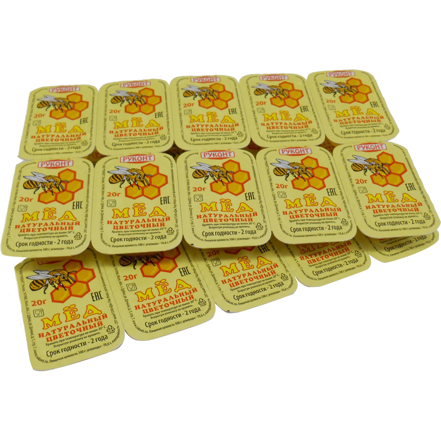 Мед порционный «Руконт» 20 г (20 штук в упаковке). Польза цветочного меда официально подтверждена научными исследованиями: доказано, что мед является великолепным средством при лечении простудных заболеваний и бессонницы. Мед способен быстро восстанавливать силы, поэтому он полезен людям, перенесшим сложные заболевания. Его успокоительные свойства используются при лечении психических расстройств. Также мед советуют употреблять в пищу при заболеваниях пищеварительной и дыхательной систем, сердечно-сосудистой недостаточности и анемии. Мед российского сбора, не содержит консервантов.Состав: мед.Энергетическая ценность на 100 г продукта: 297 ккал.Пищевая ценность на 100 г продукта: углеводы — 70,6 г.Тип упаковки: индивидуальная.Условия хранения: при температуре от 0 до 25 °С.Производитель: ООО «РУКОНТ».Страна производства: Россия.