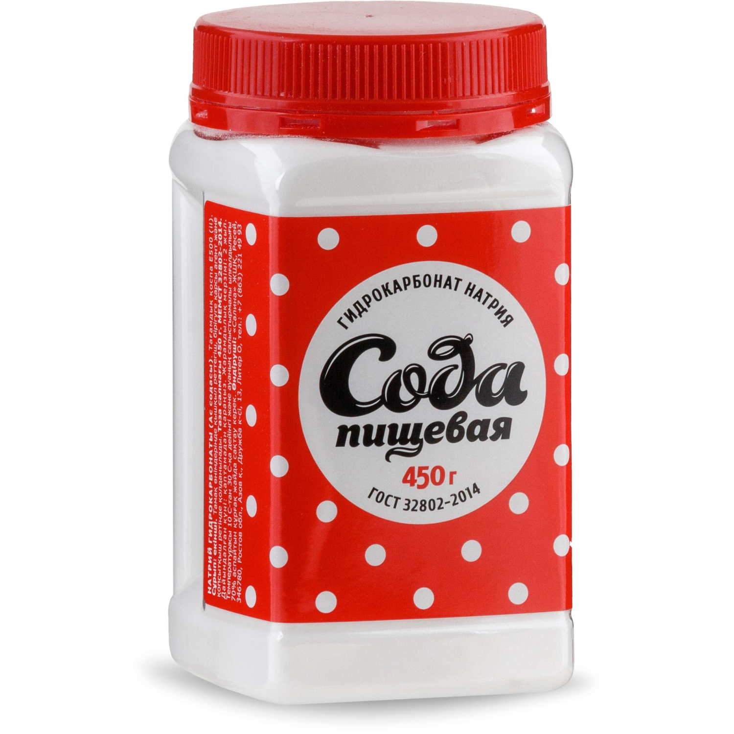 Гидрокарбонат натрия (сода пищевая). Масса нетто: 450 г. Состав: гидрокарбонат натрия Е500(i) (сода пищевая). Применяется в пищевых продуктах в качестве регулятора кислотности, антислеживающего агента и разрыхлителя. Срок годности: 2 года. Хранить в сухом помещении при температуре от 10°С до 30°С и относительной влажности воздуха не более 70%. ГОСТ 32802-2014.