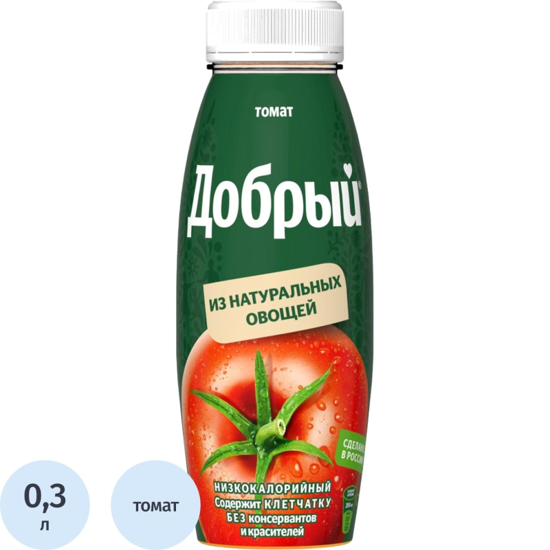 Томатный сок Добрый содержит природную клетчатку, калий и витамин Е. Насыщенный натуральный вкус спелых сочных томатов. Без консервантов и красителей. Удобно брать с собой в путешествия, на прогулку или учебу. Объем: 0.3 литра.Вкус: сладковато-соленый.Тип упаковки: пластиковая бутылка.Пищевая ценность на 100 г: белки — 1.0 г, жиры — 0.1 г, углеводы — 3.0 г. Энергетическая ценность на 100 г: 12 ккал.Условия хранения: температура от 0 до 25°С.