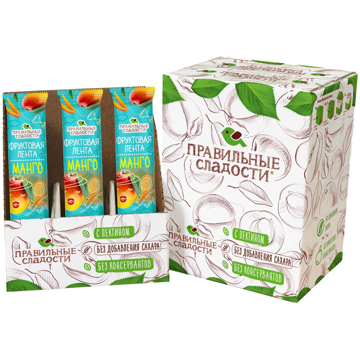 Манговая лента — натуральный продукт, изготовленный из яблочного и мангового пюре с добавлением пектина.Сертифицирована для детского питания с 3-х лет.Состав: пюре яблочное; концентрированный яблочный сок; концентрированный сок манго; желирующий агент: пектин; волокна пищевые цитрусовые; натуральный ароматизатор. Содержат сахара природного происхождения. Пищевая ценность: белки — 0,8 г, углеводы — 83 г. Энергетическая ценность: 1420 кДж, 340 ккал. Срок годности: 6 месяцев. Условия хранения: в чистых сухих помещениях при температуре не более 25°С.Масса нетто: 15 г (30 штук в упаковке). Производитель: АО «Кондитерская фабрика «Пермская», Россия.