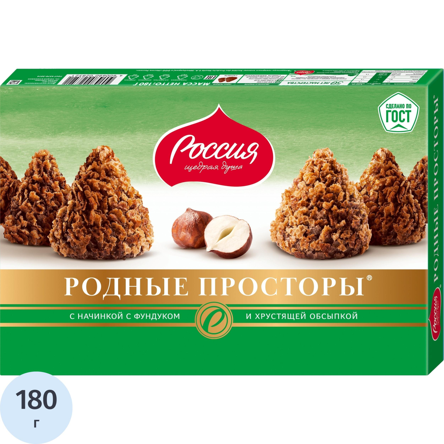 Конфеты Родные Просторы с фундуком и вафельной крошкой 180 гКонфеты Родные просторы с нежной начинкой с фундуком — это сладкое лакомство, идеальное для подарков на праздники или для собственного удовольствия. Они подходят для употребления взрослыми и детьми старше 3-х лет.Продукт содержит: сахар, жир специального назначения (из пальмового масла), сыворотка молочная сухая, какао тёртое, мука пшеничная (содержит глютен), эквивалент масла какао (масло пальмовое, масло ши), какао-порошок с пониженным содержанием жира, фундук, молочный жир, продукты яичные, эмульгаторы (лецитины, E476), ароматизатор натуральный, соль, разрыхлитель (гидрокарбонат натрия). Продукт может содержать арахис, другие орехи и сою.Пищевая ценность на 100 г: белки — 5 г, жиры — 28 г, углеводы — 61 г, энергетическая ценность — 2203 кДж/527 ккал. На порцию 21,2 г: белки — 1,1 г (1% от средней суточной потребности), жиры — 6 г (7%), углеводы — 13 г (4%), энергетическая ценность — 467 кДж/112 ккал.Подойдут для взрослых и детей старше 3-х лет.Условия хранения: хранить при температуре 18°С и относительной влажности воздуха не более 75%. Внешний вид и/или характеристики товара могут быть изменены производителем в соответствии с производственным процессом.
