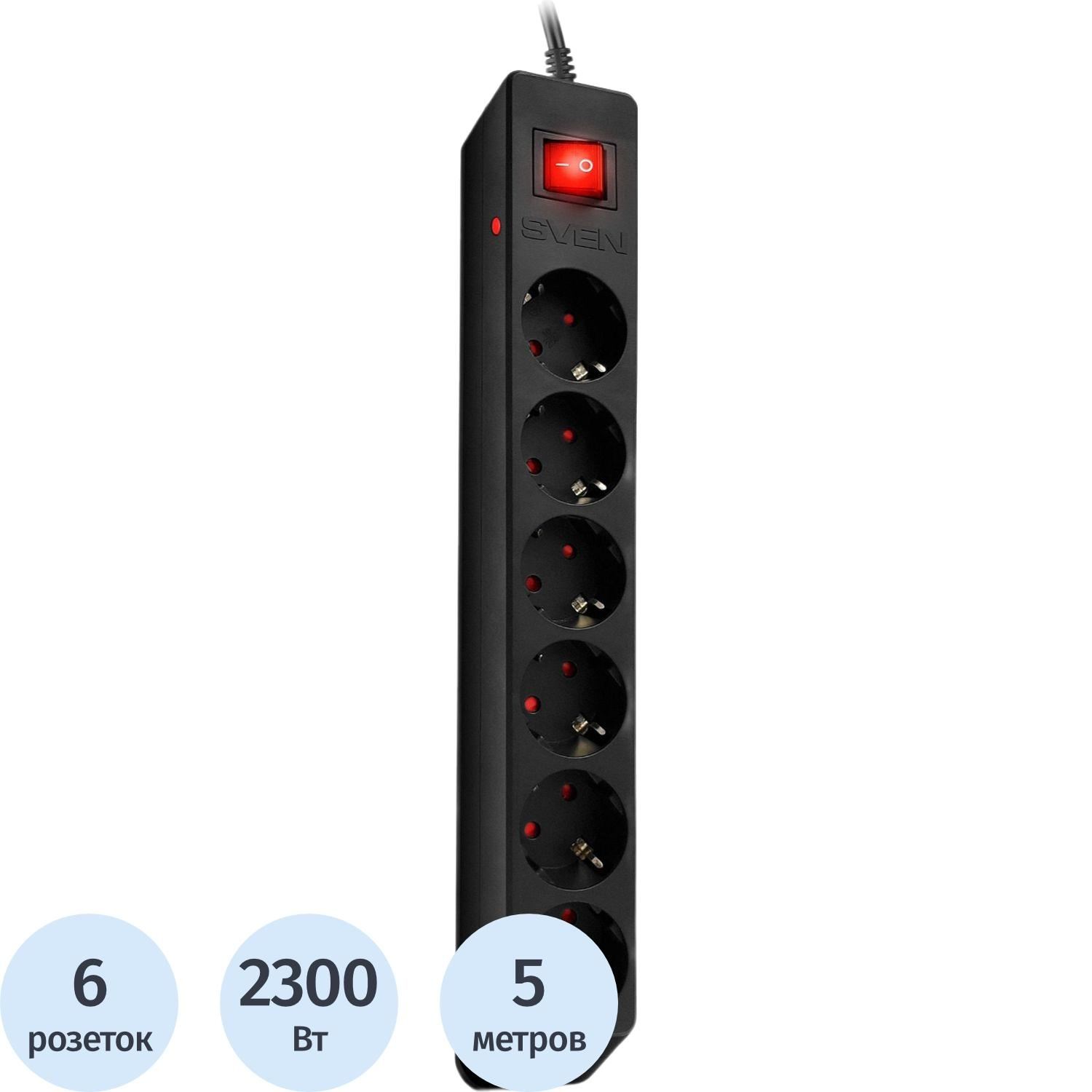 Сетевой фильтр SVEN Optima 5,0 м (5м/6р с защит шторки) черн(SV-021030)