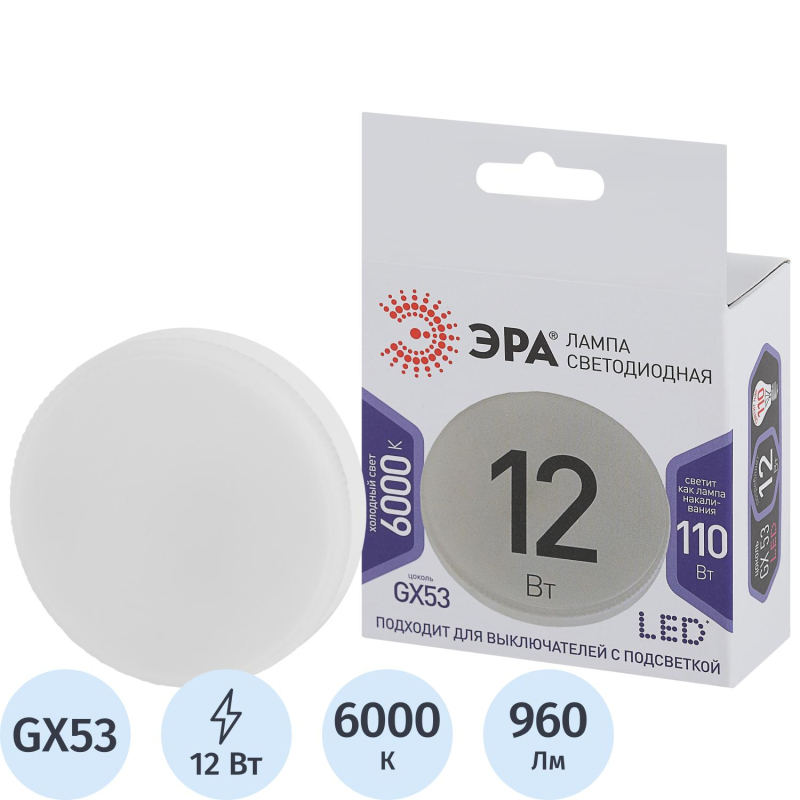Лампа светодиодная ЭРА STD LED GX-12W-860-GX53 GX53 12Вт холодный свет