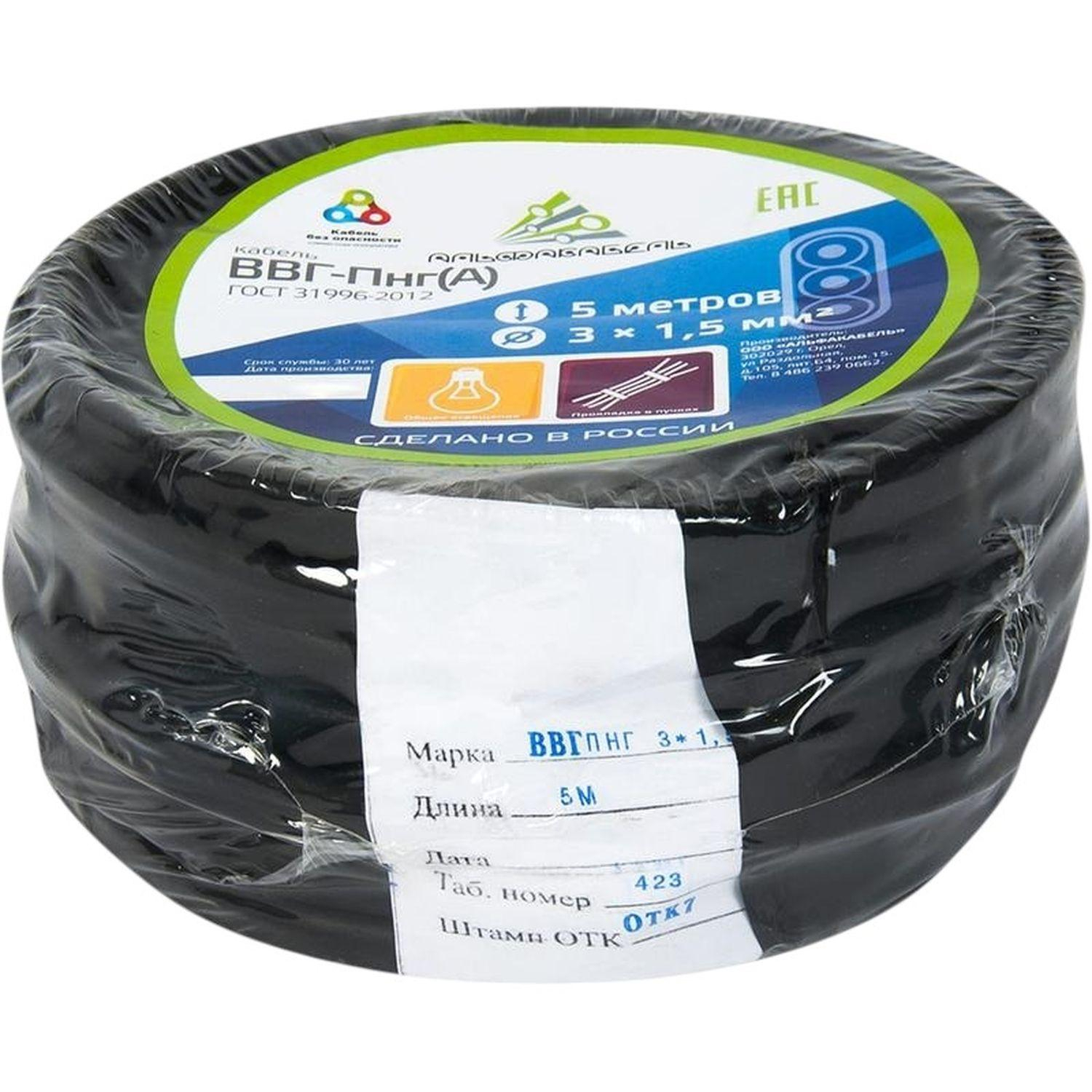 Кабель ВВГ-Пнг(А) 3×1.5 0.66кВ (5 метров) бухта чёрный Альфакабель 65547 ГОСТМарка кабеля — ВВГ-Пнг(А)Кол-во и материал жил — три медные жилыСечение жил — 1.5 мм²Длина — 5 метров• НазначениеКабели предназначены для передачи и распределения электроэнергии в стационарных электротехнических установках на номинальном переменном напряжении до 0,66 кВ и частоте 50 Гц. Обозначение (П) указывает на плоскую форму, а (нг) — на нераспространяющую горение конструкцию, что делает его безопасным для использования в жилых и коммерческих объектах. (А) — Категория по исполнению в части показателей пожарной безопасности.• Область примененияПрименяется в жилых, офисных и производственных помещениях.• Принцип действияПринцип действия кабеля основан на передачи электроэнергии по токоведущим жилам.• Дополнительные принадлежности или аксессуарыВ стандартную комплектацию входит само изделие.Внешний вид и/или характеристики товара могут быть изменены производителем в соответствии с производственным процессом.