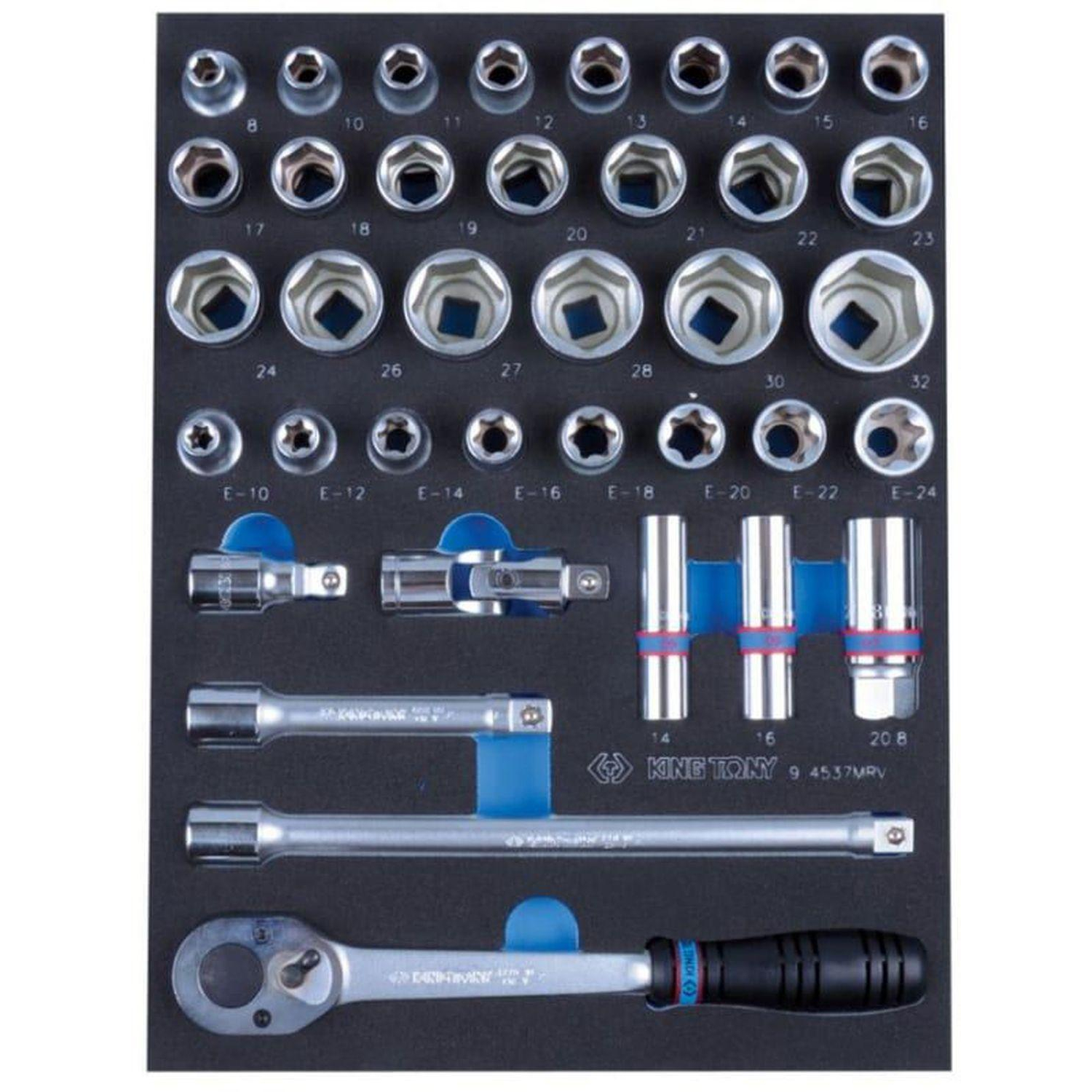 Набор торцевых головок с принадлежностями (1/2″, ложемент, 37 предметов) King Tony 9-4537MRV представляет собой комплект приспособлений профессионального уровня. Набор обеспечивает удобство обслуживания крепежных узлов. Легкий маслостойкий ЭВА служит материалом ложемента (в случае деформации легко восстанавливает форму). Комплектация Головка торцевая стандартная шестигранная 1/2″, King Tony серии 4335M — 8, 10, 11, 12, 13, 14, 15, 16, 17, 18, 19, 20, 21, 22, 23, 24, 26, 27, 28, 30, 32 мм; Головка торцевая TORX Е-стандарт 1/2″, L = 39 мм King Tony серии 4375M — E10, E12, E14, E16, E18, E20, E22, E24; Трещотка 1/2″, 250 мм, 32 зубца, флажковая, фиксатор King Tony 4779-10GR; Удлинитель 1/2″, King Tony серии 4251R — длина 125 мм, 250 мм; Удлинитель 1/2″, 15 градусов, с шаровым окончанием King Tony 4293-02 — длина 50 мм; Кардан 1/2″ King Tony 4791R; Головка свечная шестигранная 1/2″, L = 70 мм, резиновый фиксатор King Tony серии 4635R — 16, 21 мм; Головка для свечей зажигания 12 граней, 1/2″, резиновый фиксатор King Tony серии 4630RC — 14 мм; Ложемент.Внешний вид и/или характеристики товара могут быть изменены производителем в соответствии с производственным процессом.
