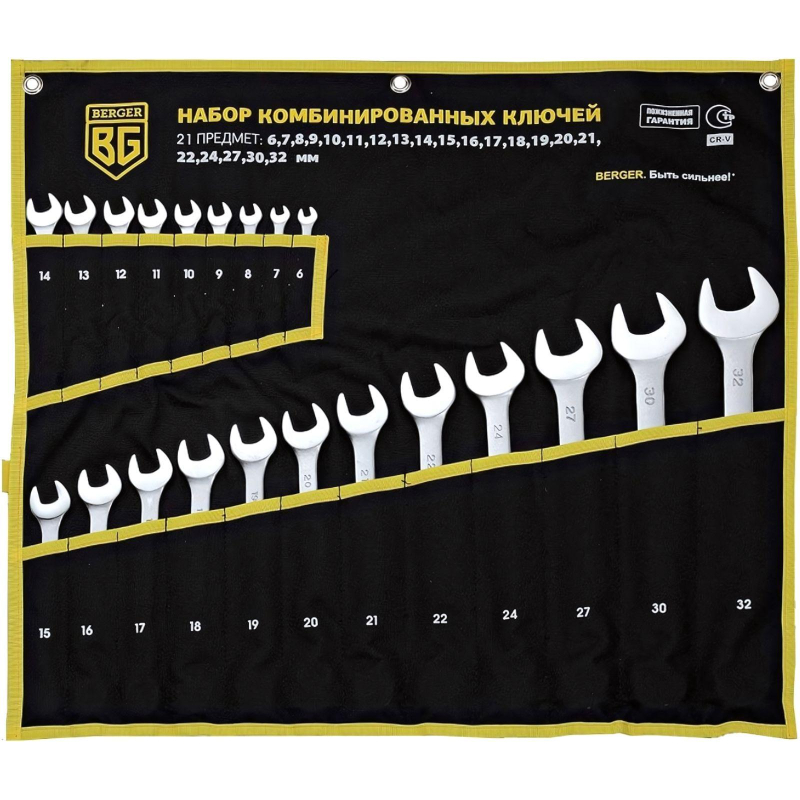 Набор комбинированных ключей 21 шт. Berger BG1146 — комплект ручных инструментов. Изделия изготовлены из высококачественной стали, устойчивы к износу. Представленный набор станет оптимальным вариантом для оснащения автосервисных и производственных мастерских благодаря широкому ассортименту. Набор ключей комбинированных 21 предмет, в матерчатом чехле: 6, 7, 8, 9, 10, 11, 12, 13, 14, 15, 16, 17, 18, 19, 20, 21, 22, 24, 27, 30, 32 мм.Внешний вид и/или характеристики товара могут быть изменены производителем в соответствии с производственным процессом.