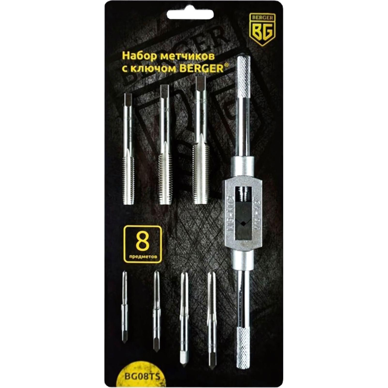 Набор метчиков с ключом 8 предметов BERGER. 7 шт. — метчик однопроходной метрический: М3×0,5; М4×0,7; М5×0,8; М6×1,0; М8×1,25; М10×1,5; М 12×1,25 мм; 1 шт. — ключ для метчиков М3-М12. Материал: легированная сталь 9XC (средняя твердость 61 HRC).Упаковка-блистер. Маркировка, нанесенная на блистерную упаковку облегчает идентификацию.Внешний вид и/или характеристики товара могут быть изменены производителем в соответствии с производственным процессом.
