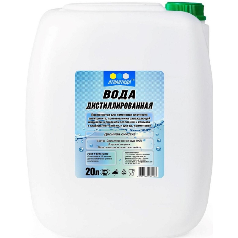 Вода дистиллированная Атлантида 20 л проходит многоступенчатую очистку. По своим качественным показателям соответствует требованиям ГОСТ 58144-2018 (имеет сертификат соответствия). Широко применяется в бытовых и медицинских целях, а также при разведении концентратов охлаждающих жидкостей, теплоносителей, для корректировки электролитов.