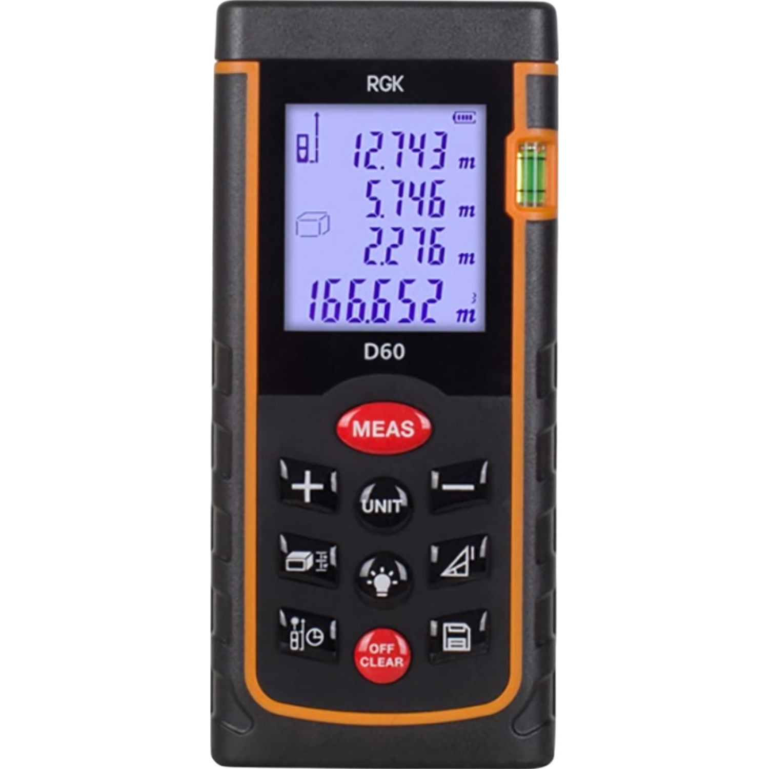 Лазерный дальномер RGK D60 — улучшенная модель рулетки D60 в новом корпусе, со встроенным пузырьковым уровнем и расширенным функционалом.Основные преимущества RGK D60Точность и надежностьПри максимальной дистанции в 60 метров точность измерений составляет не менее 2 мм. Это позволяет использовать дальномер RGK D60 в ответственных работах, например, при строительстве, разметке территории, в геодезии и т. п.Встроенный в корпус пузырьковый уровень обеспечит уверенные измерения с рук и поможет ровно установить дальномер на штативе.ФункциональностьБольшой набор функций превращает дальномер RGK D60 в универсальный инструмент 3 в 1, заменяющий рулетку, калькулятор и блокнот для записей.Арифметические вычисления — расчет площади и объема с сохранением промежуточных замеров на экране, сложение и вычитание результатов прямо в процессе измерений.Расчет по Пифагору — определение длины путем косвенных измерений. Помогает рассчитать недоступные расстояния, например, высоту дома или участка стены.Измерение заданного расстояния — откладывает отрезки определенной длины. Достаточно задать расстояние, и дальномер RGK D60 подскажет, в какую сторону сдвинуть прибор для достижения указанной дистанции. Это пригодится при разметке помещения для определения точной высоты от пола, стен и потолка или расстояния от соседних предметов интерьера.Режим непрерывных измерений — максимально точные измерения расстояния благодаря получению перпендикуляра к целевой поверхности. В режиме непрерывных измерений наклоните прибор вниз и вверх, и дальномер RGK D60 выведет на экран максимальное и минимальное значения: последнее будет соответствовать измерению, приведенному в горизонт.Встроенная памятьПозволяет записывать до 100 результатов измерений и просматривать их впоследствии. Сохранение доступно как для длины, так и для площади и объема, а также для результатов арифметических вычислений.Откидная скобаПрименяется для измерений из углов. Дальномер RGK D60 также может осуществлять измерения от передней и задней граней прибора, и от крепежного винта для измерений от центра штатива.КорпусВыполнен из мягкого, приятного на ощупь пластика, а благодаря рифлению и массивности дальномер комфортно удерживать в руках. Выпуклые кнопки с наглядными пиктограммами легко прощупываются даже сквозь рабочие перчатки и позволяют выполнять измерения вслепую. Защита класса IP54 предохраняет прибор от попадания внутрь строительной пыли и водяных брызг.Питание прибораОсуществляется от двух батарей типа ААА. Для экономии энергии дальномер RGK D60 автоматически выключается после длительного бездействия. Для включения и выключения подсветки служит отдельная кнопка.Внешний вид и/или характеристики товара могут быть изменены производителем в соответствии с производственным процессом.