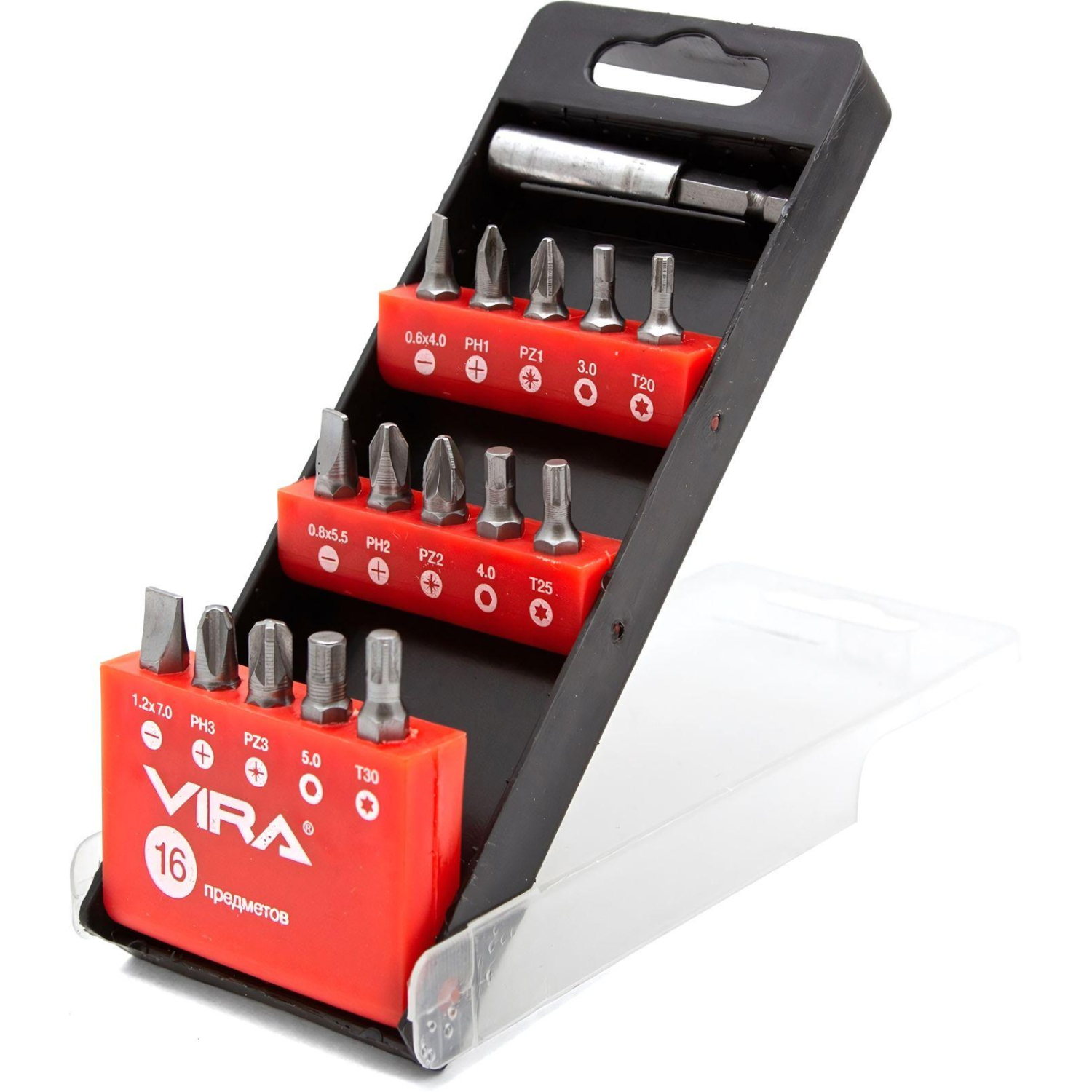 Набор бит Vira с магнитным держателем. В состав набора входит 15 бит различных типоразмеров - шлицевые (SL0.6x4 мм, SL0.8x5,5 мм, SL1.2x8 мм), крестообразные (PH1, PH2, PH3, PZ1, PZ2, PZ3), внутренний шестигранник (HEX3, HEX4, HEX5), Torx (T20, T25, T30), а также магнитный держатель для бит с приводом на шестигранный хвостовик 1/4''. Все инструменты изготовлены из высокопрочной хром-ванадиевой стали, что делает набор пригодным как в бытовом, так и в профессиональном использовании.