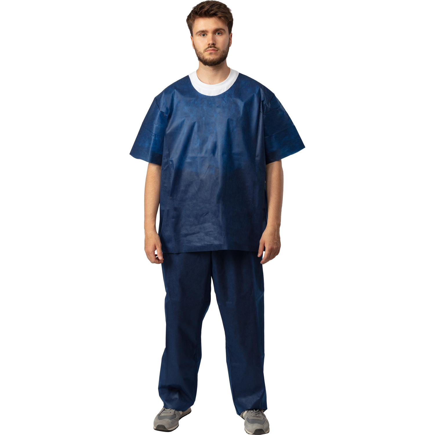 Костюм хирургический (рубашка + брюки). Размер 56-58. Костюм состоит из рубашки и брюк. Рубашка прямого силуэта, без застежки, рукав короткий. Брюки прямые. Швы наружные сварные (безниточные). Изготовлен из гипоаллергенного, безворсового, воздухопроницаемого, водоотталкивающего полипропиленового нетканого материала плотностью 42 г/м. кв. Упаковка: полиэтиленовый пакет. Нестерильный. Срок годности 4 года.