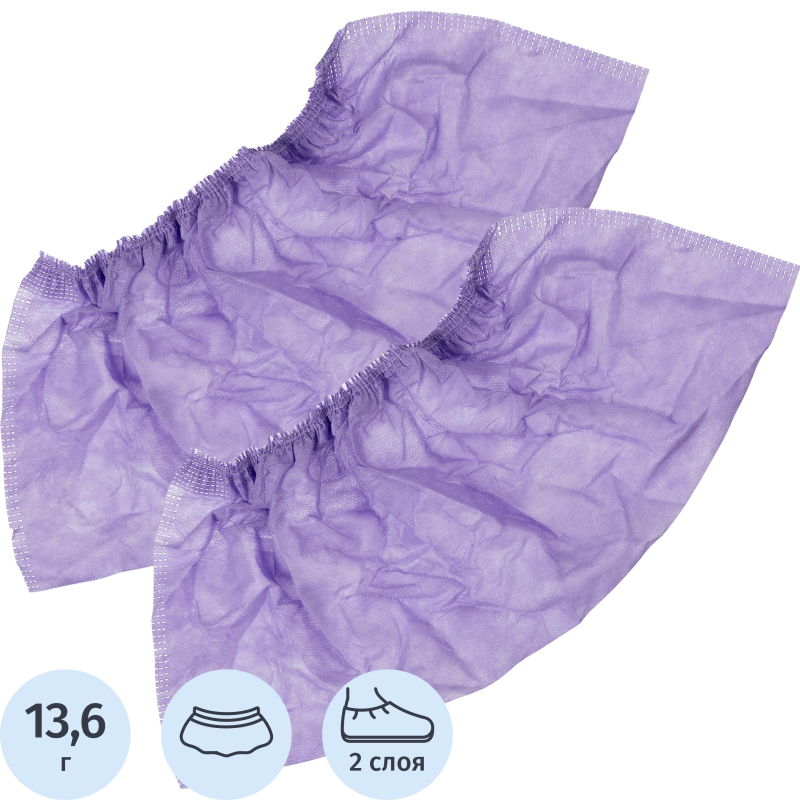 Бахилы одноразовые медицинские из нетканого материала EleGreen, ламинированные, бело-фиолетовые, повышенной прочности. Изготовлены из полиэтилена высокого давления и спанбонда повышенной плотности 50 мкм, удерживаются на обуви двойной резинкой, вес пары 13.6 г, размер 160±10×390±20 мм, позволяют поддерживать чистоту помещения и бережно относятся к половому покрытию, подходят для использования в музеях, выставочных залах, галереях и медицинских учреждениях, упакованы по 250 пар.