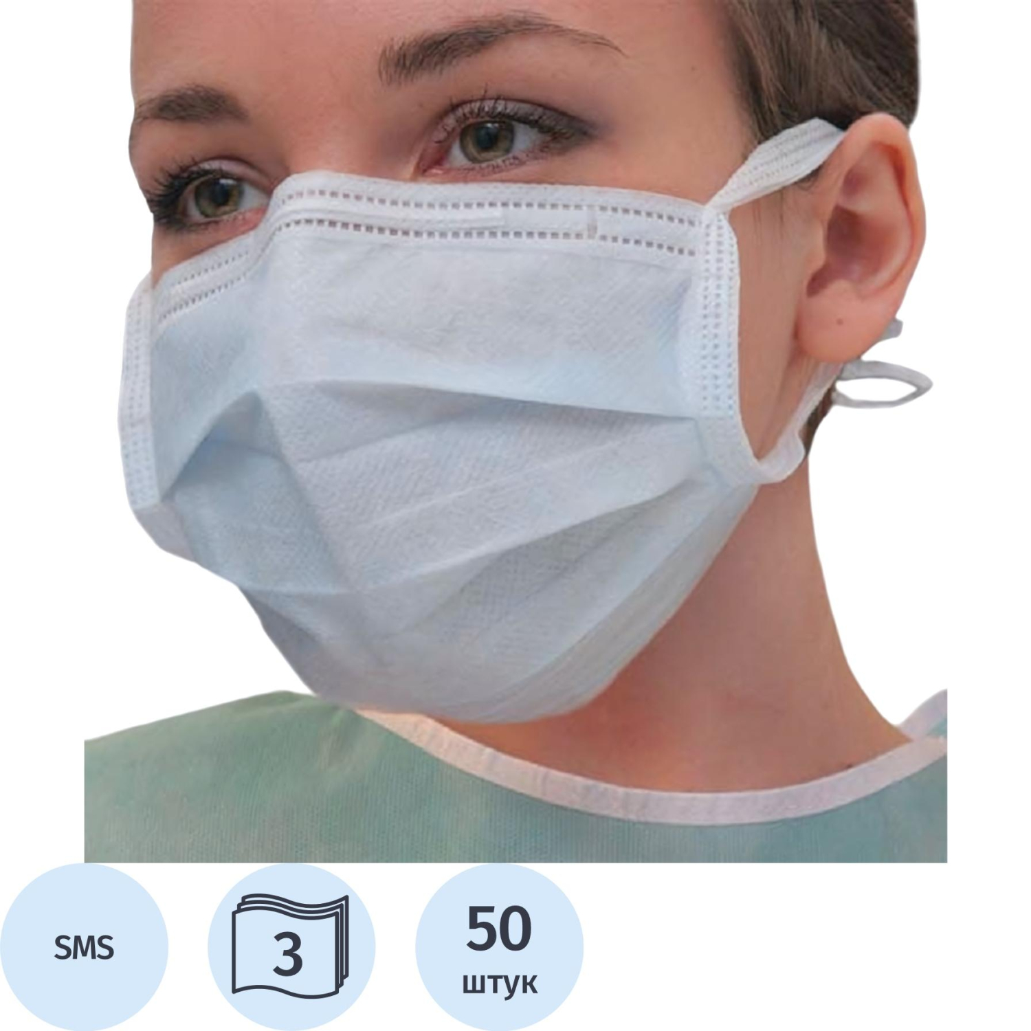 Маска медицинская трехслойная на завязках одноразовая. Имеет носовой фиксатор для более плотного и комфортного прилегания маски в области носа. Гибкий носовой фиксатор — лента PE полиэтилен. Размер: 17,5×9,5 см. Трехслойная: 2 наружных слоя изготовлены из гипоаллергенного полипропиленового нетканого материала, обладающего водоотталкивающими свойствами, воздухопроницаемостью и пониженным ворсоотделением. Фильтрующий элемент (промежуточный слой) — ’мельтблаун’. Упакована в коробки по 50 штук. Нестерильно. Срок годности 4 года. Законодательные и технические документы