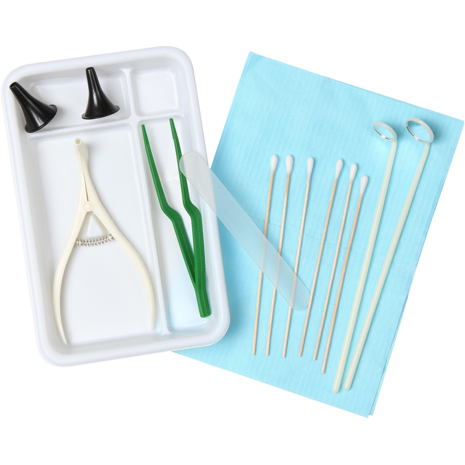 Набор отоларинголога предназначен для проведения диагностических манипуляций и лечебных процедур. Стерилизован оксидом этилена. Набор № 2, состав: 1. Носовое зеркало (30 мм) — 1 шт. 2. Шпатель полимерный для языка — 1 шт. 3. Гортанное зеркало (16 мм и 22 мм) — 2 шт. 4. Ушная воронка (4,0 мм и 4,6 мм) — 2 шт. 5. Пинцет ушной полимерный (150 мм изогнутый) — 1 шт. 6. Тампон хлопковый (150 мм) — 6 шт. 7. Салфетка из полимерного нетканого полотна — 1 шт. 8. Лоток полимерный — 1 шт. Производство: Россия