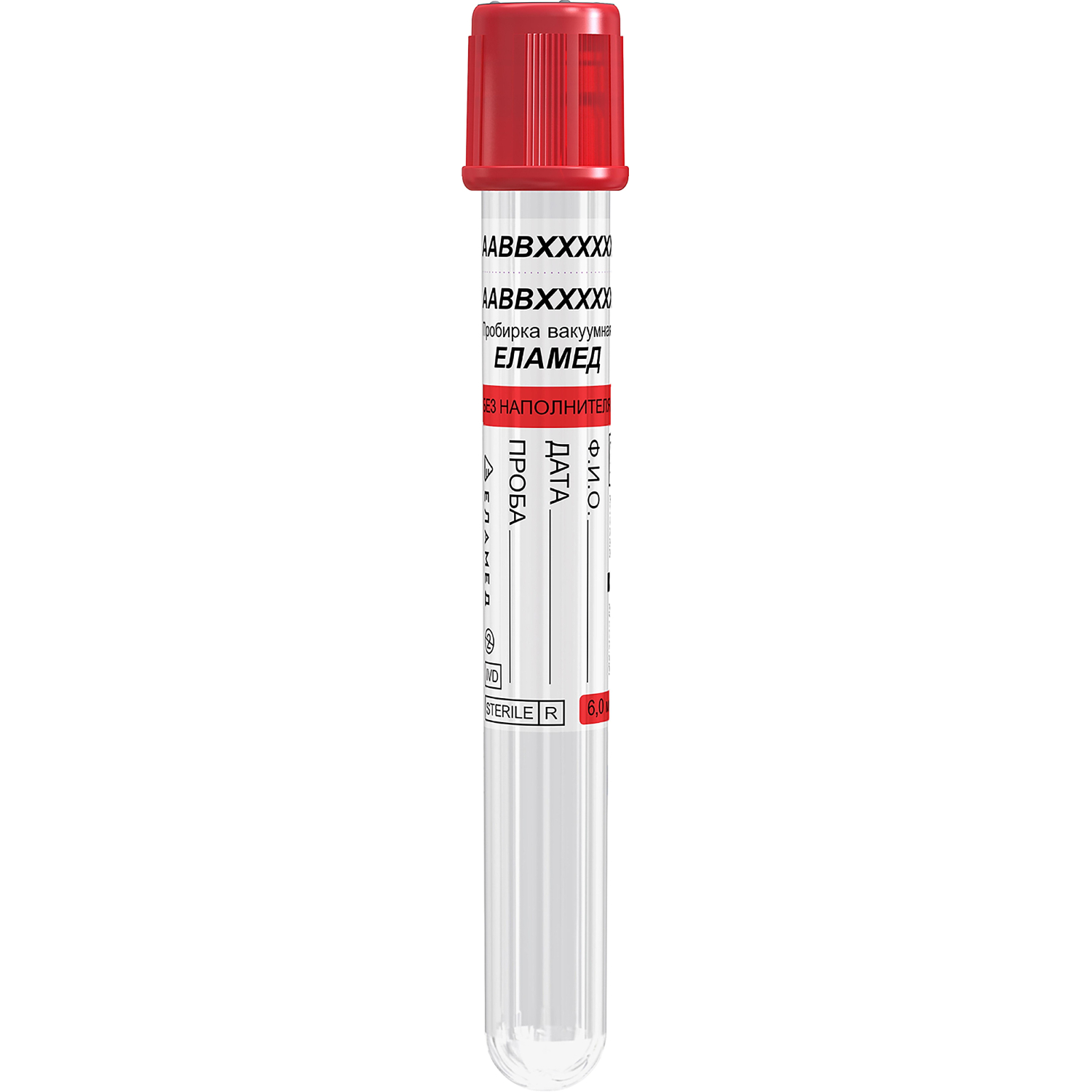 Пробирки Еламед без наполнителя используются для биохимических, иммунологических и серологических тестов, а также как вторичные пробирки и пробирки для аликвотирования.Применение: сыворотка, цитратная плазма, гепаринизированная плазма, цельная кровь. Номинальная вместимость 6 мл, высота пробирки 100 мм, диаметр пробирки 13 мм. Наполнитель: нет. Крышка пробирки: крышка без резьбовая, двухкомпонентная состоит из пробки, которая вставлена в защитный колпачок. Полностью открытый верх стоппера (пробки) снижает риск повреждения иглы пробозаборника при отклонении пробирке в гнезде трака на борту прибора от строго вертикального положения. Материал изготовления защитного колпачка — полиэтилен высокой плотности. Материал изготовления пробки — бром бутилкаучук с углублением. Этикетка на русском языке содержит следующую информацию: наименование изготовителя или товарный знак изготовителя, наименование изделия, номер партии, наименование добавки, знак стерильности/способа стерилизации, знак однократности применения, срок годности, номинальная вместимость, знак использования только для диагностики in vitro.Цветовая кодировка пробирки: красная. Вакуумные пробирки поставляются в пенопластовом штативе в термоусадочной пленке с этикеткой-инструкцией. 100 штук в упаковке.