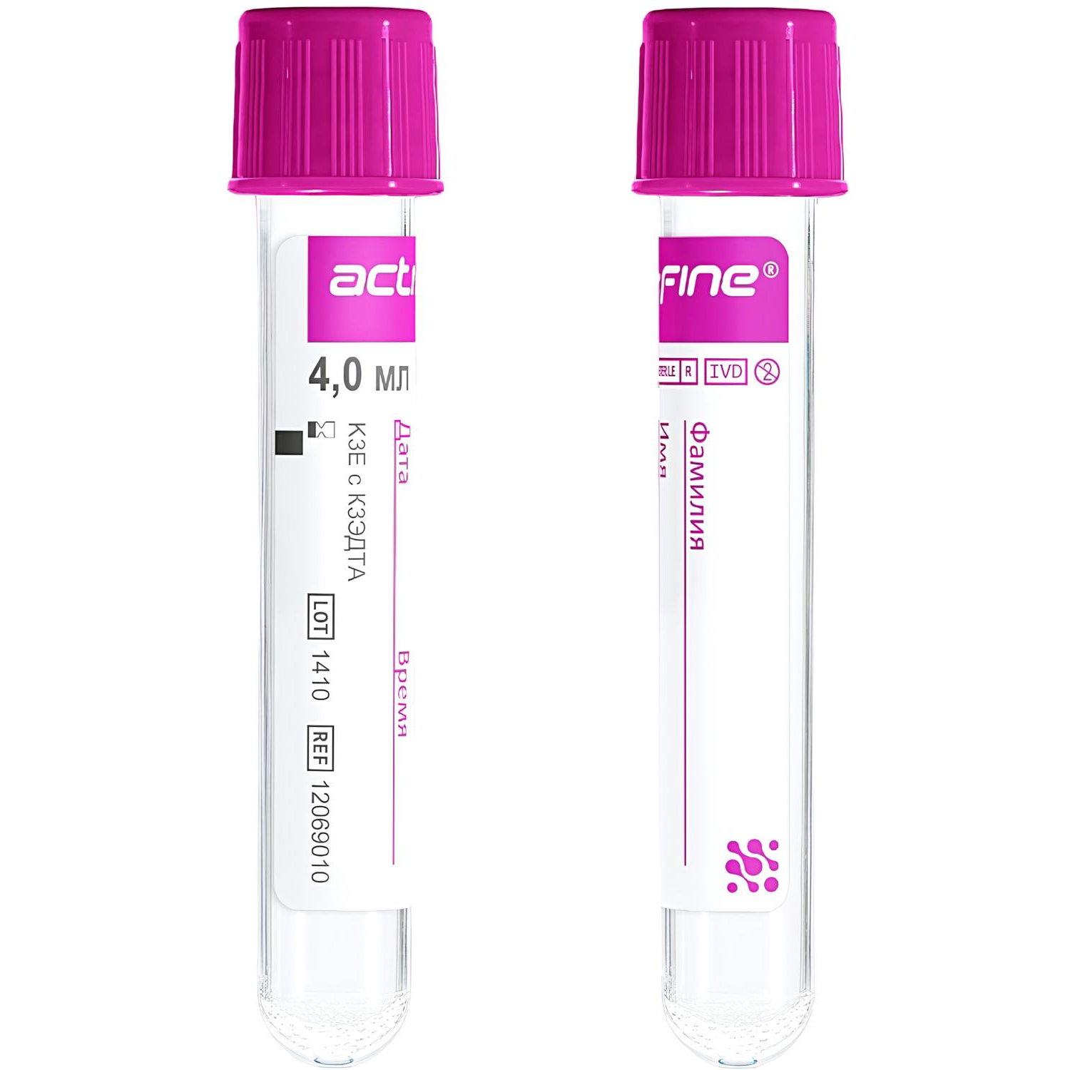 Пробирка вакуумная с заданным уровнем вакуума для взятия точного количества биоматериала. Материал пробирки — пластик (полиэтилентерефталат). Объем забираемой крови не более 4,0 мл (соответствует линии наполнения на этикетке). Максимально допустимое отклонение объема забираемого биоматериала не более 10% от номинального объема пробы. Размер пробирки не более 13×75 мм. Крышка пробирки состоит из: пластикового колпачка, резиновой пробки и маркировочного кольца. Пластиковый колпачок бледно-лилового цвета из полиэтилена, на поверхности которого нанесены противоскользящие выступы для исключения проскальзывания в руке лаборанта и рабочей системе анализатора. Колпачок плотно фиксирует внутреннюю часть крышки к пробирке. Резиновая пробка выполнена из несмачиваемого кровью бромбутилкаучука, плотно фиксирована к пластиковому основанию крышки и необходима для прокалывания иглой. Пробка сохраняет герметичность и вакуум в пробирке. Маркировочное кольцо черного цвета из полипропилена служит для быстрой и эффективной зрительной идентификации типов пробирок на всех этапах лабораторного процесса, а также для разделения потоков проб. Внешняя и внутренняя часть крышки зафиксированы между собой и составляют единую конструкцию. На крышке и пробирке полнозаходная винтовая резьба, исключающая самопроизвольное открывание при транспортировке и центрифугировании, и обеспечивающая многократное плавное открывание и закрывание пробирки без дополнительных усилий и аэрозольного эффекта. На внутренних стенках пробирки сухой мелкодисперсный антикоагулянт К3ЭДТА. Этикетка пробирки бумажная, с полями для внесения данных пациента, горизонтальной бледно-лиловой полосой, логотипом производителя, отметкой уровня наполнения. Этикетка содержит информацию: каталожный номер, номер лота, срок годности, описание содержимого, объем забираемой крови, символ стерильности и способ стерилизации (радиация), символ однократности применения. Область применения: гематология. Температурный диапазон хранения вакуумных пробирок +4°C...+25°C. Упаковка — не более 50 шт. в пластиковом штативе, запаянном в полиэтилен. Этикетка на упаковке на русском языке.