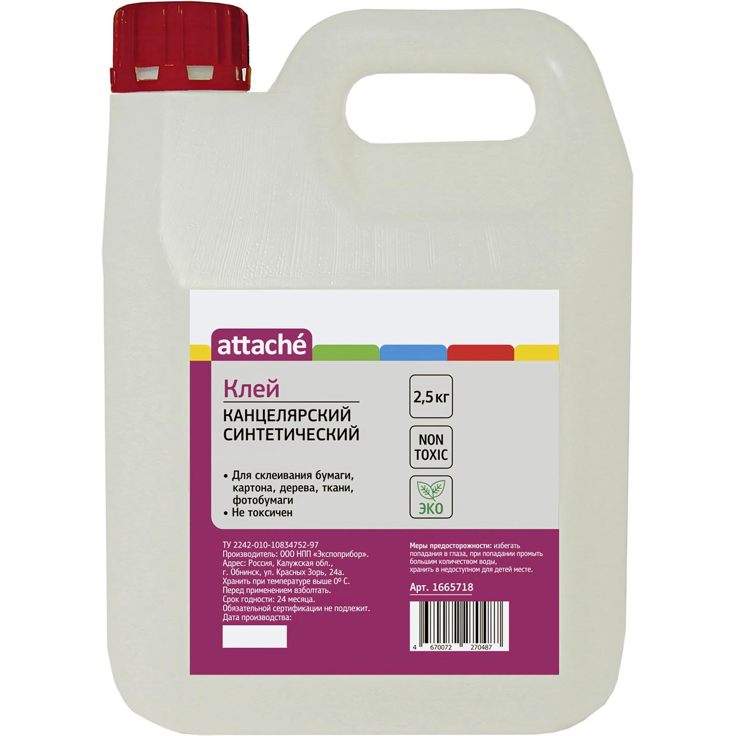 Синтетический канцелярский клей Attache 2,5 кг. Морозостойкий, прозрачный, высокого качества. Предназначен для офисных канцелярских работ по бумаге и картону, а также для приклеивания фотографий. Клей нетоксичен, не содержит растворителей. Способ применения: поверхность перед склеиванием должна быть сухой, без загрязнений. Клей равномерно нанести на склеиваемые поверхности, соединить и прижать. Соединение оставить в сжатом состоянии не менее двух часов. Максимальный эффект достигается путем плотного сжатия склеиваемых поверхностей до полного высыхания. Время полного высыхания — около 24 часов при температуре 20 °С и относительной влажности воздуха 65%.