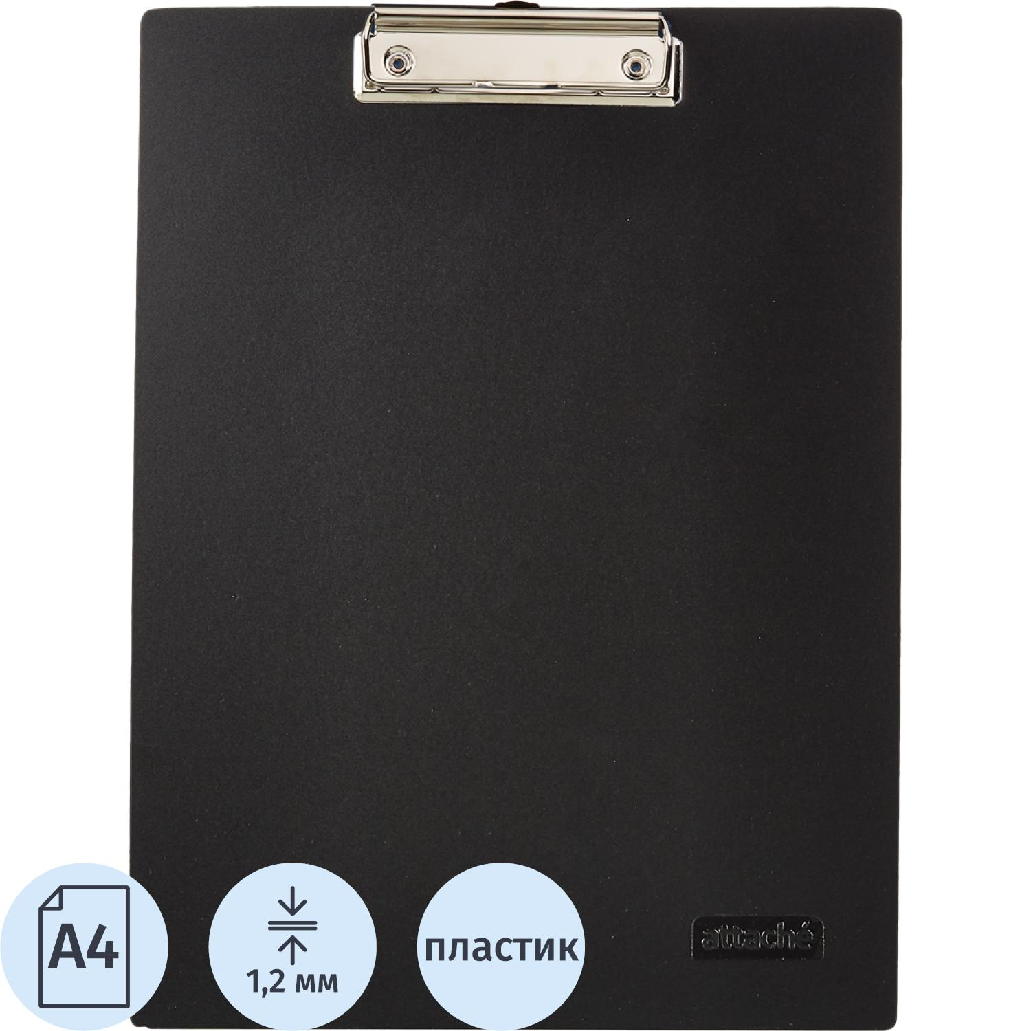 Папка-планшет Attache формата А4 (235×315 мм) изготовлена из плотного пластика (полипропилена) черного цвета. Толщина материала — 1,2 мм. Позволяет комфортно работать с документами на весу. Металлический прижим надежно удерживает листы и файлы. Справа внизу со стороны зажима есть логотип.