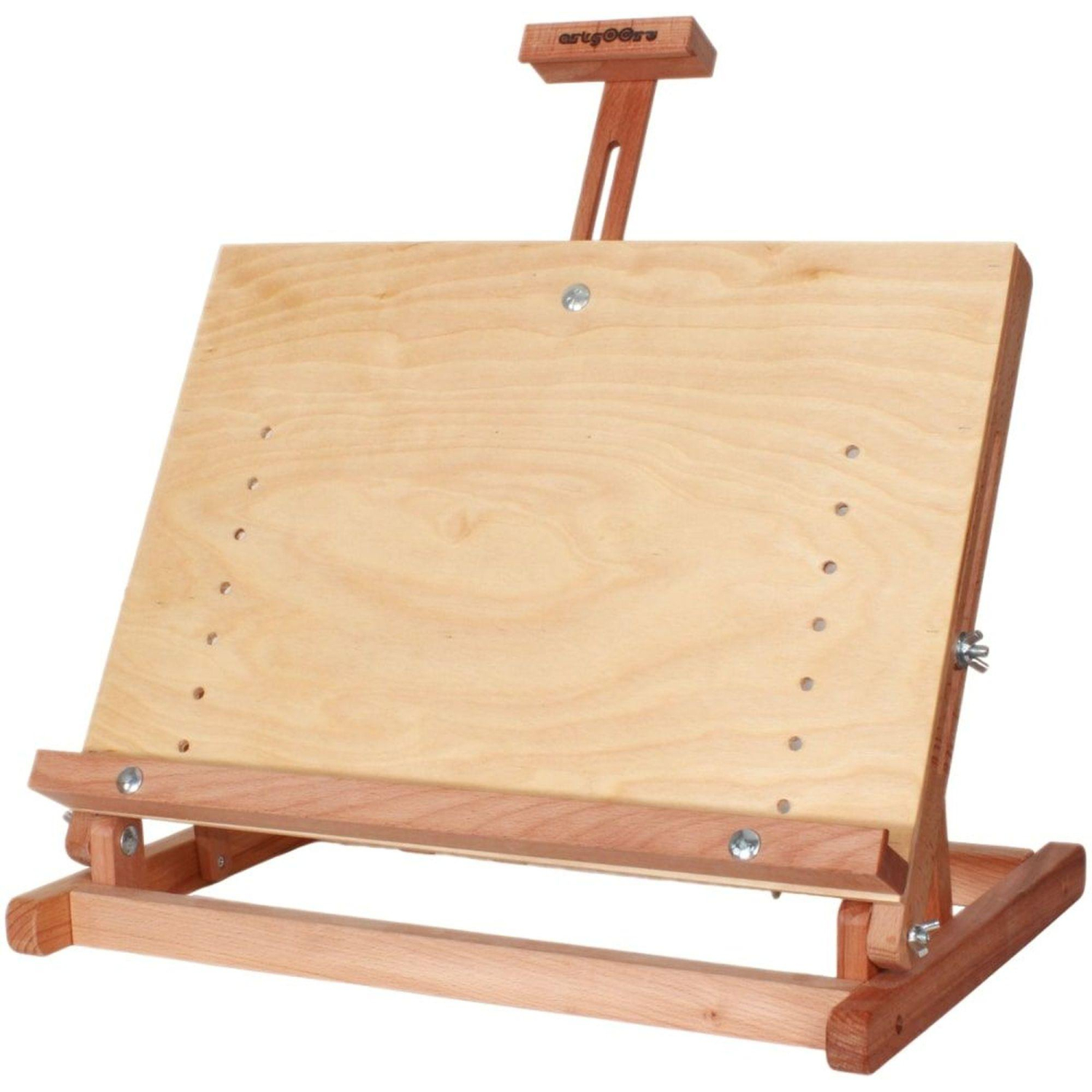 Мольберт настольный серии ARG-16 компании «Туюкан».Небольшой комбинированный настольный мольберт — планшет с подъемной штангой. Предназначен для работы с маленькими холстами, для эскизных работ на бумаге и картоне, а так же для демонстрации картин, фотографий, рисунков и багетов.Мольберт изготовлен из высококачественного бука, который покрыт специальным защитным составом.Максимальная высота холста на подрамнике или планшета — 54 см.Выдерживает вес до 3 кг.Дополнительные характеристики:— размер основания: 47.5×33 см;— особенности: мольберт-планшет с подъемной штангой, изменяемой высотой полочки и регулируемым наклоном.