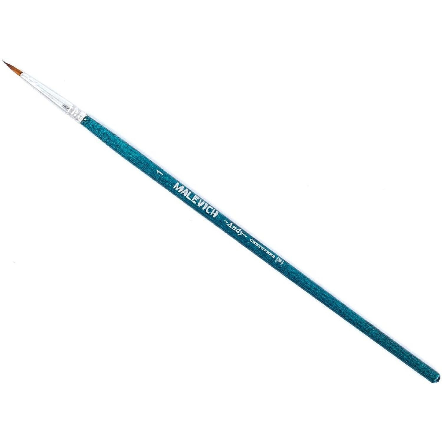 Кисть художественная Малевичъ Andy круглая синтетика №1Кисть из синтетики серии Andy — это мягкая универсальная синтетика, которая подходит практически для любых видов красок. Ей удобно работать с гуашью, маслом, акварелью, акрилом, темперой. Маслом можно работать в лессировочной технике с разбавителем. Синтетика рыжего цвета с темным кончиком, ручка покрыта синим лаком, ворс закреплен втулкой из латуни с двойной обжимкой.Ручка кисти короткая — 14 см. Длина ворса (выставка) короткая. Номер кисти соответствует диаметру пучка в мм.