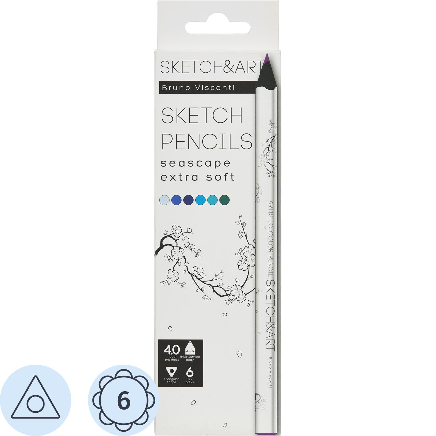 Карандаши цветные художественные классические Sketch&Art Морской пейзаж 6 карандашей 6 цветов трёхгранные (утолщённые) Набор цветных карандашей Sketch&Art состоит из 6 утолщённых трёхгранных карандашей с диаметром корпуса 10 мм и диаметром грифеля 4 мм. Корпус выполнен из липы и покрыт защитным лаком на водной основе с авторским принтом. Карандаши имеют высокое содержание цветных пигментов, что обеспечивает яркий и насыщенный цвет. Грифель проклеен дисперсионным клеем, что придаёт ему прочность и устойчивость к деформации. Упаковка — картонная коробка с европодвесом; размер упаковки 58×11×201 мм.