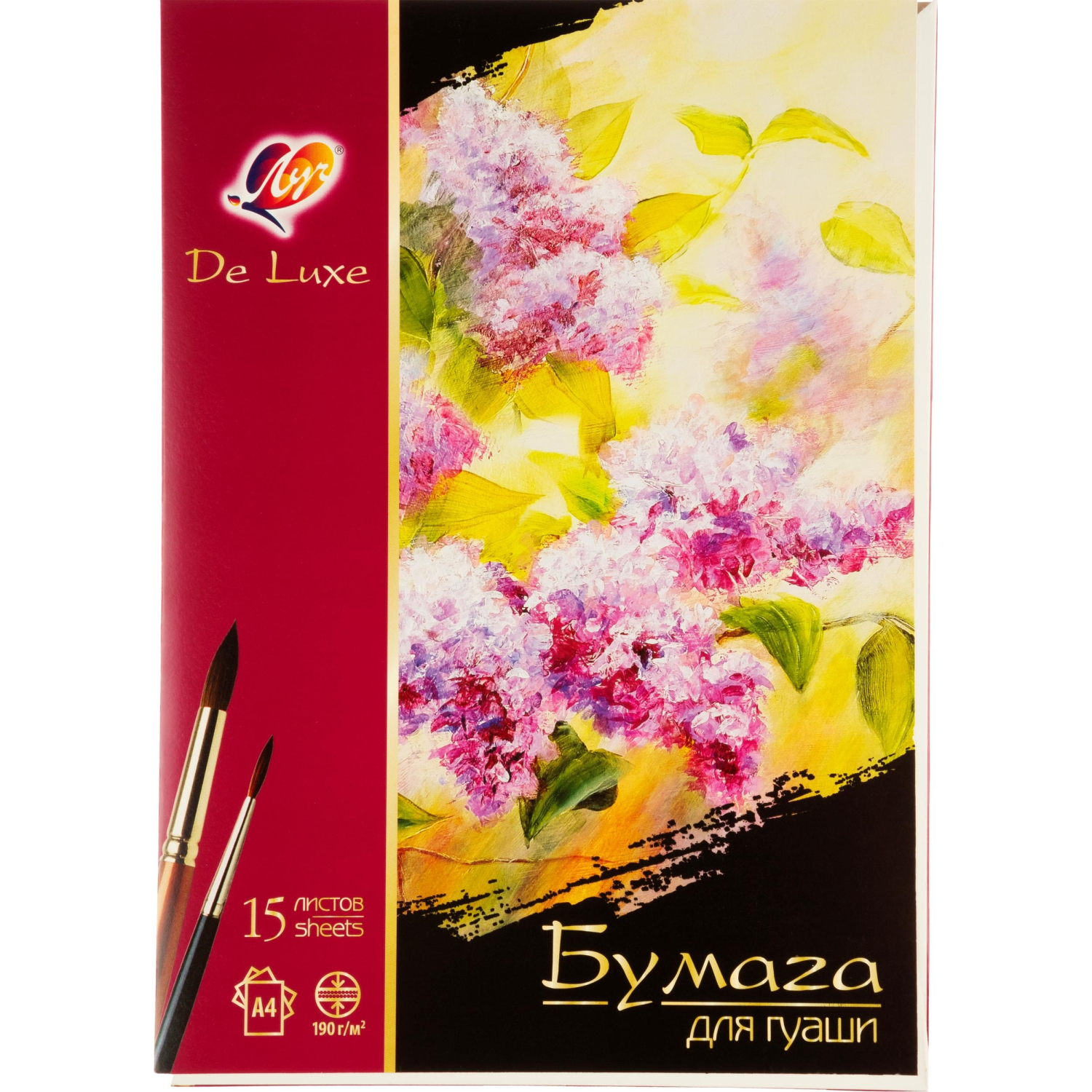 Бумага для акрила, гуаши и темперы Луч De Luxe А4 15 листовБумага для гуаши «Люкс» — высококачественная рисовальная бумага. Предназначена для рисования гуашью, акрилом, подойдёт также для чернографитных, цветных и акварельных карандашей, восковых мелков, фломастеров и других мягких художественных материалов. Папка с бумагой для гуаши идеально подходит для детей, учащихся и студентов. Состоит из 15 листов плотной бумаги без тиснения. Данная бумага позволяет работать на ней различными материалами, что делает привлекательным данное изделие для художественных школ и кружков, ведь уроки начинаются с техники рисования именно гуашевыми красками.Формат: А4.Количество листов: 15.Назначение: для гуаши и графических материалов.Внутренний блок: офсетная бумага.Плотность блока: 190 г/кв.м.Цвет блока: белизна 100%.Упаковка: папка на два клапана из высококачественного картона.Страна производитель: Россия.